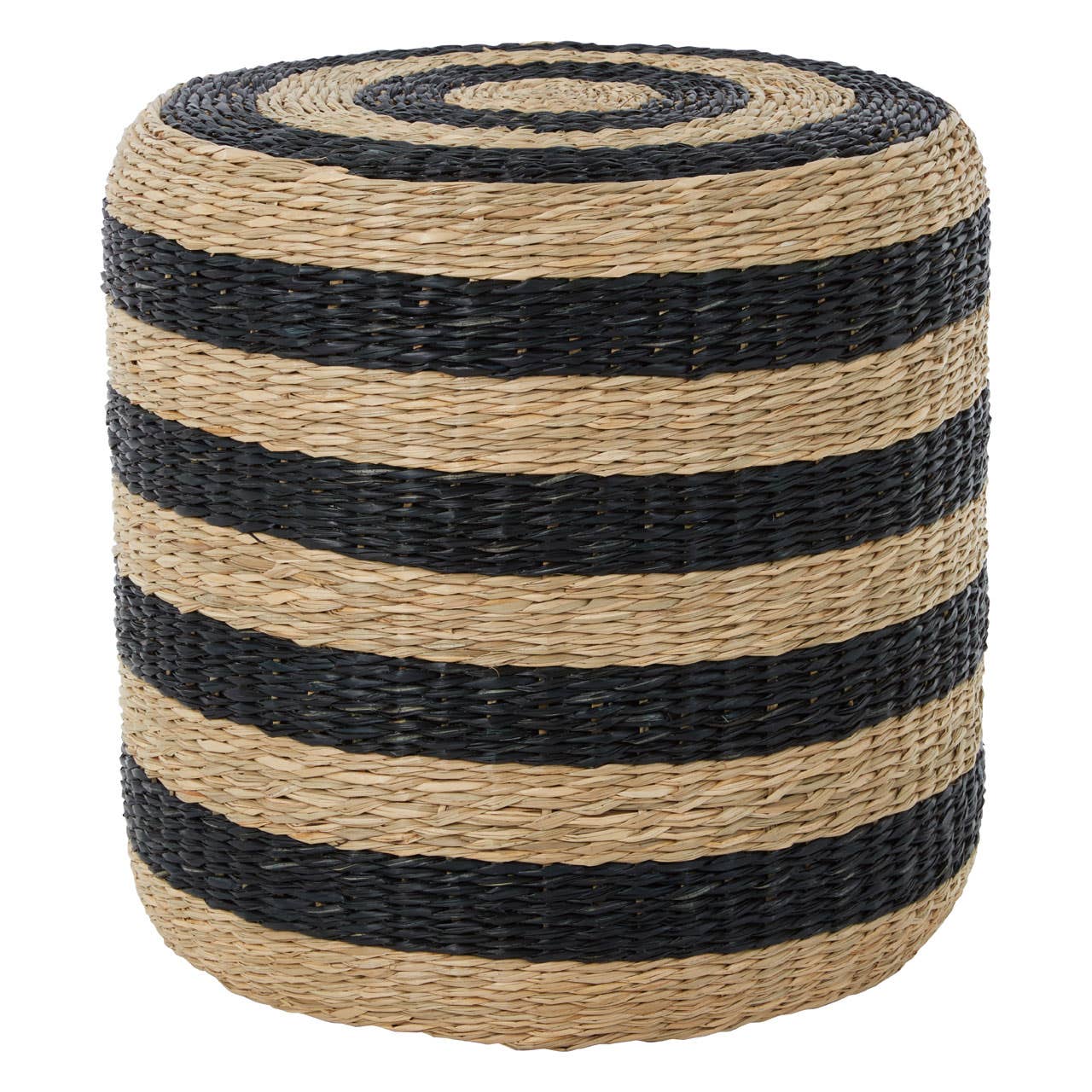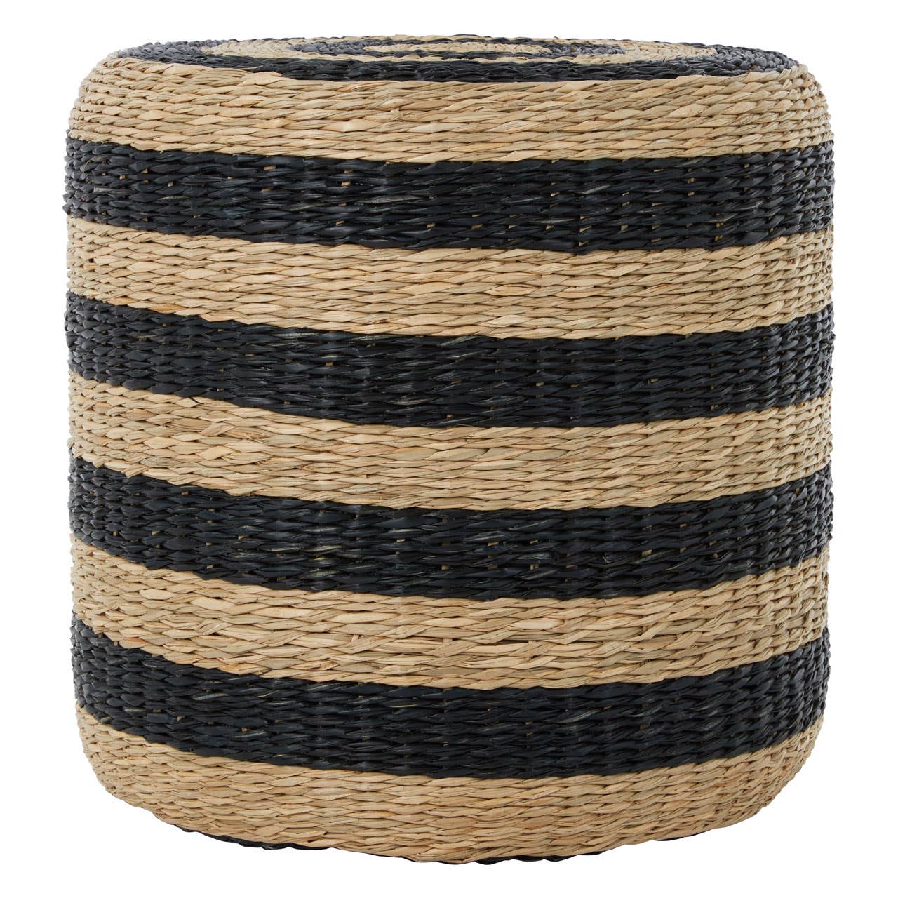Intricately handwoven from natural seagrass fibres and wadded up with soft foam, this eco-friendly pouffe will make a versatile addition to the furniture. Featuring a weaving pattern, this seagrass pouffe in drum shape embodies a tribal aura with its black stripe design.