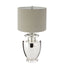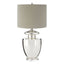 This table lamp has a clear glass urn-shaped base that offers ample light and brings a touch of classic appeal to the design. The lamp has a grey fabric shade with a finial on it that contrasts the reflective base.