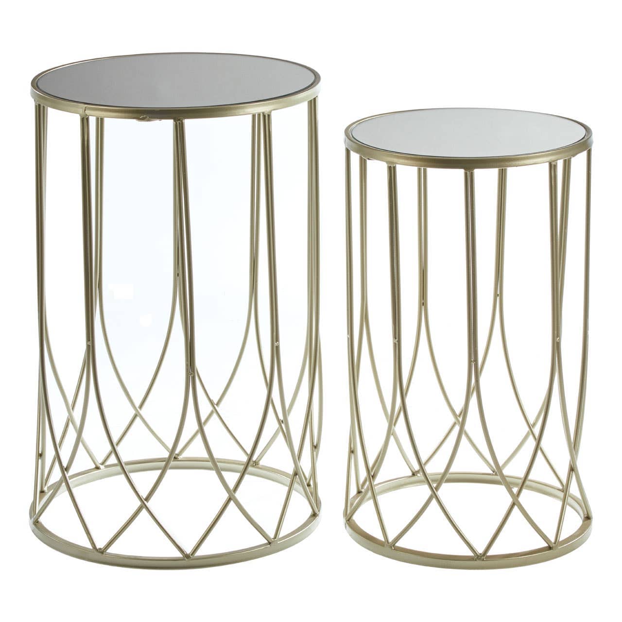 The base of each table is characterised by vertical iron lines that curve at the bottom, their overlapped structure evoking exotic Moorish design. Made from strong iron, each base is finished in a golden champagne colour. Black glass tops complement the gold. Their cylindrical design allows them to be stacked together.