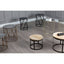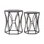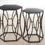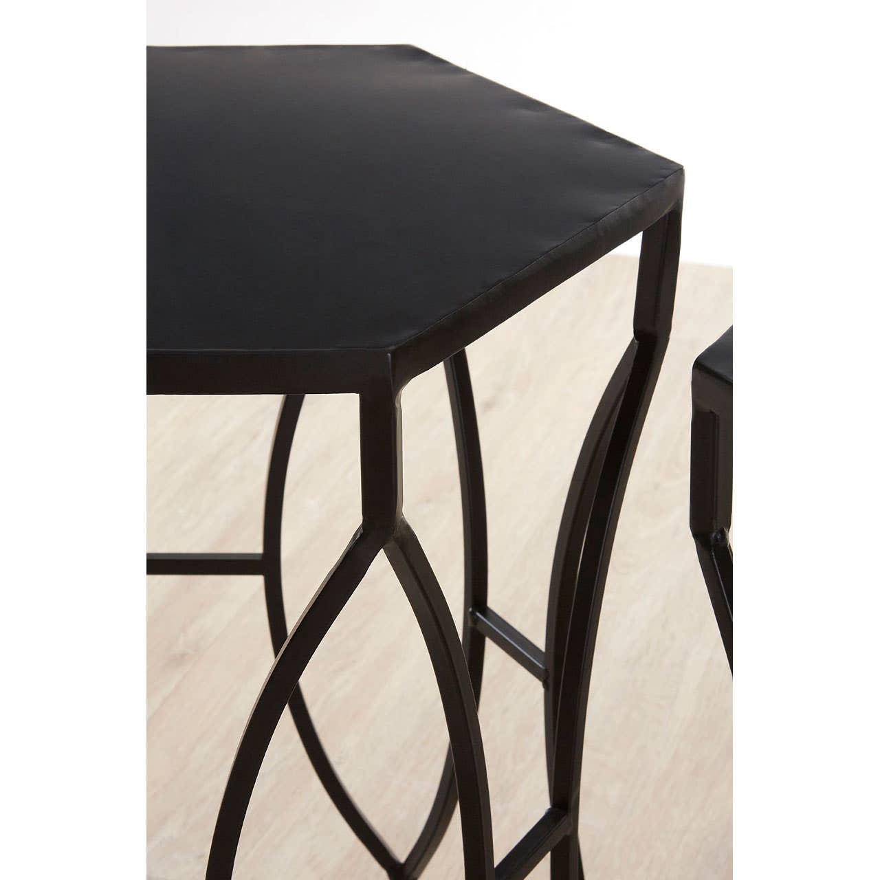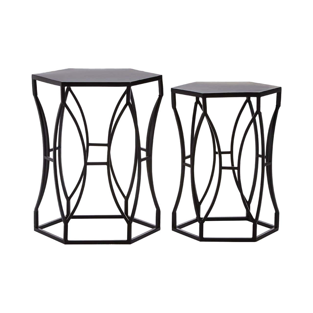 This pair of contemporary tables use tough iron to create decorative symmetrical patterns. Hourglass shapes coalesce with oval motifs beneath the polygonal tabletops and above the polygonal bases. The combined result is a pair of fluid accent pieces that complement industrial style furniture and lighting.