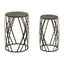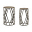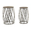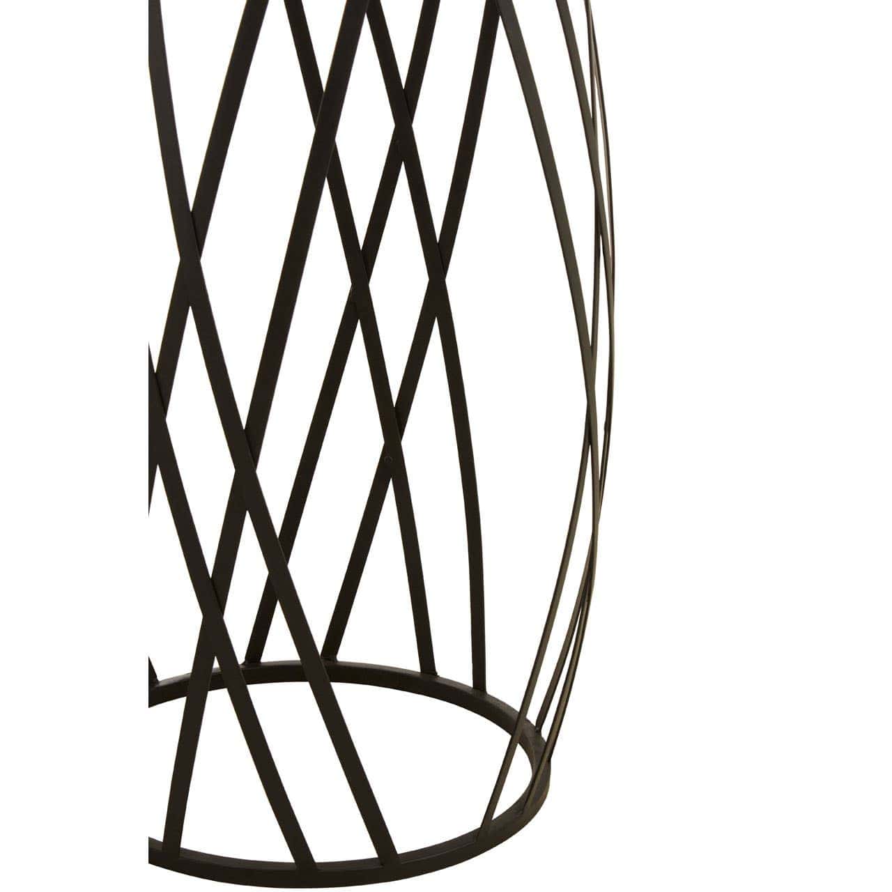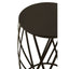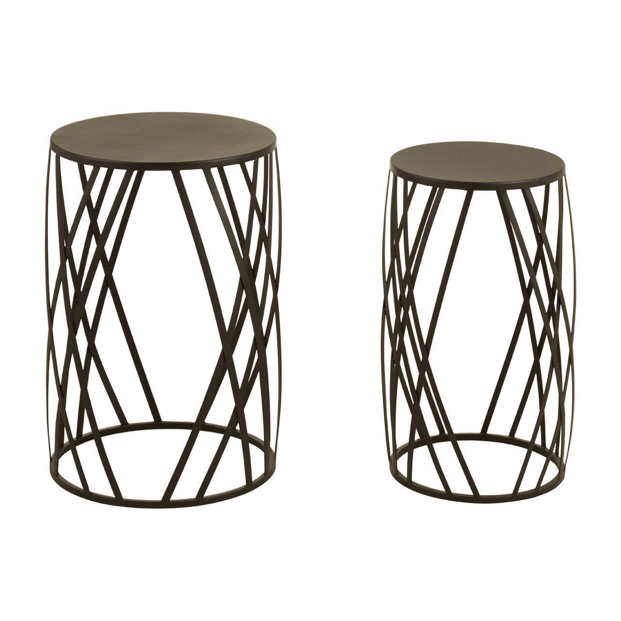 Black finish iron lines intersect each other to form a lattice design. Each table has a cylindrical structure and the openwork design ensures that they do not impose themselves on their surroundings. Their round tops are made from smooth, solid iron. The smaller nests neatly inside the larger when not in use.