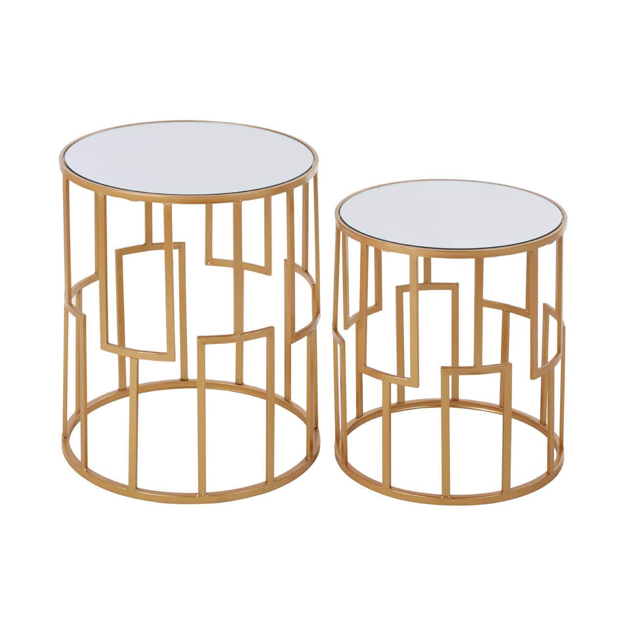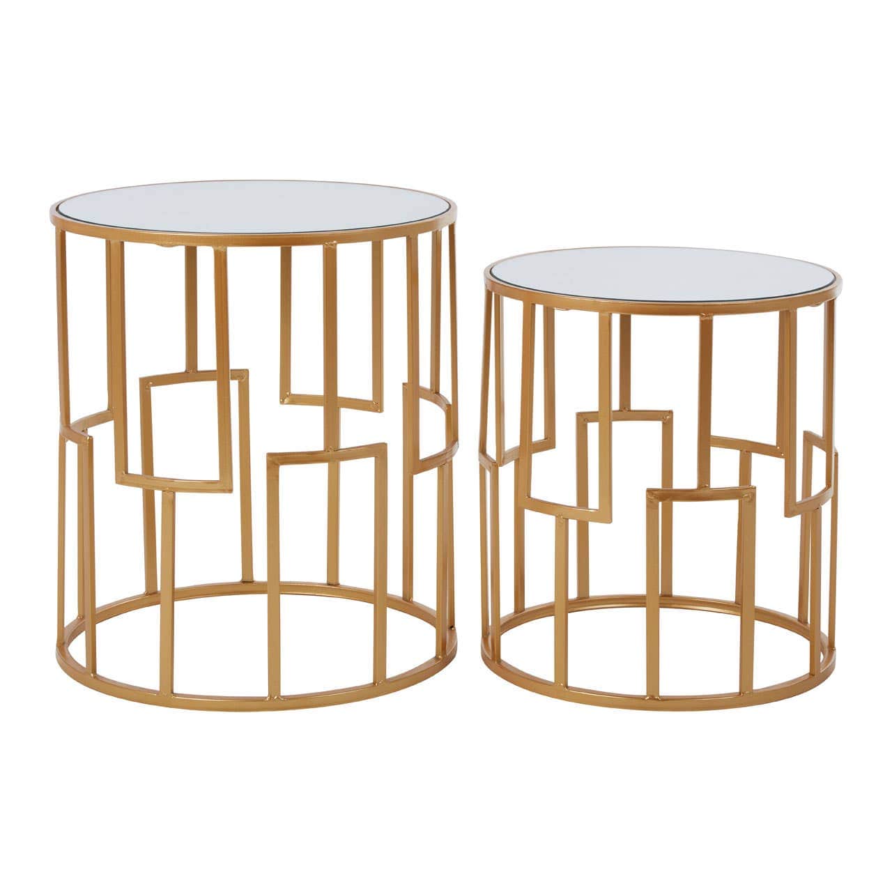 The frames of the Avantis side tables are formed from smooth metal. Their sequential lines draw the eye, and the rich gold creates a captivating finish that complements luxe-inspired interior design settings. Both tables have a round pane of mirrored glass set into their tops. Coordinate them with warm metallics.