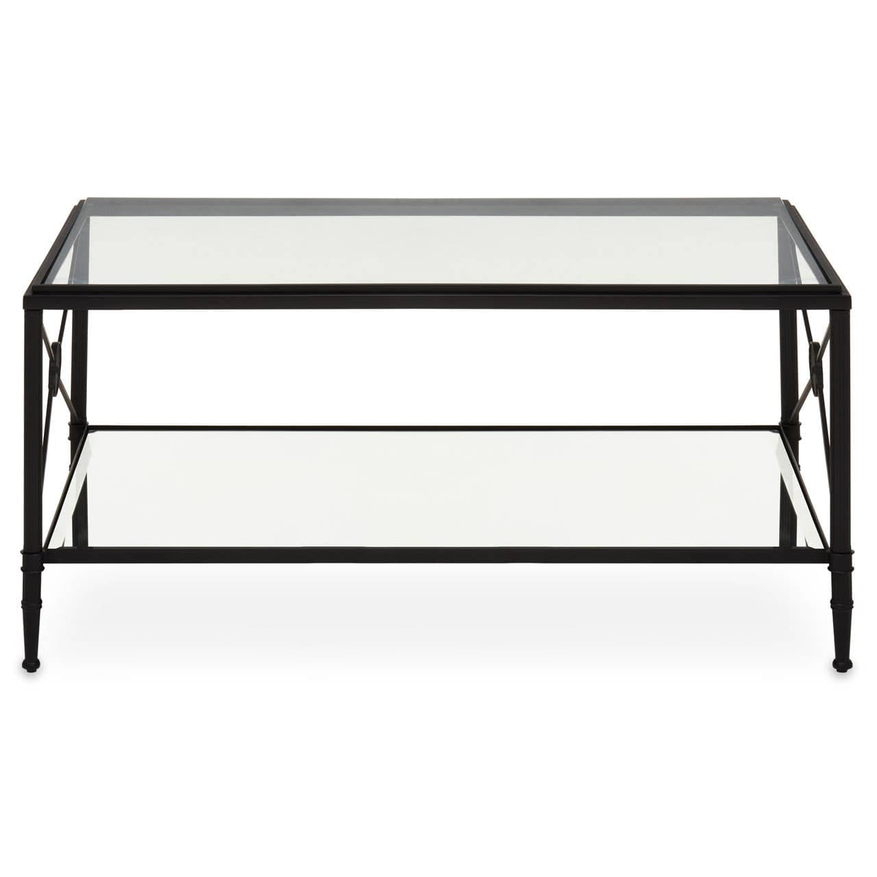 This coffee table has a rectangular metal frame in a black finish forming a monochrome contrast with the clear glass. Supporting two-tier glass levels, the frame features a cross design at each end which is connected with a floral motif.