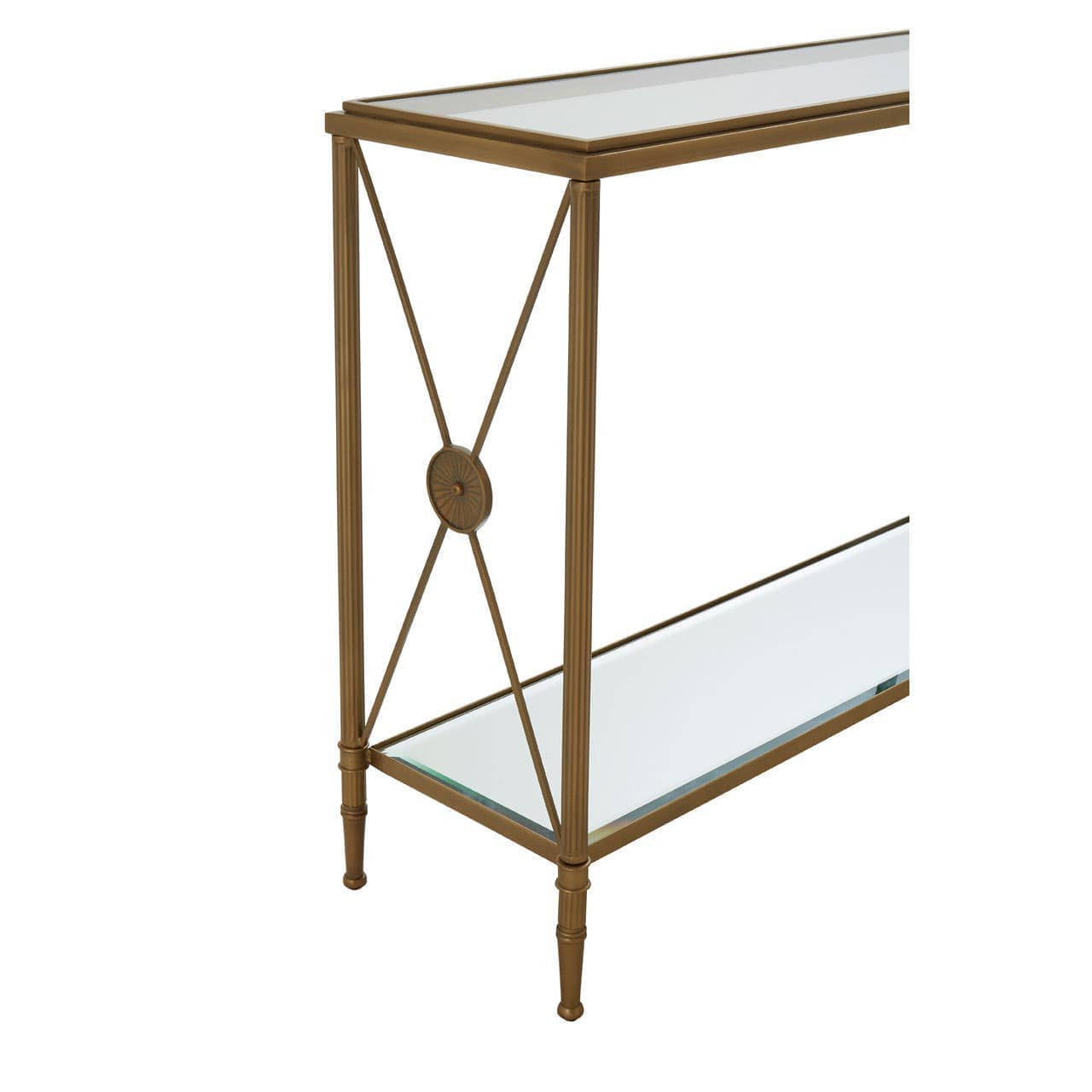 This console table has a rectangular metal frame in a tarnished brass finish adding to the antique effect. Supporting two-tier glass shelves, the frame features a cross design at each end which is connected with a floral motif.