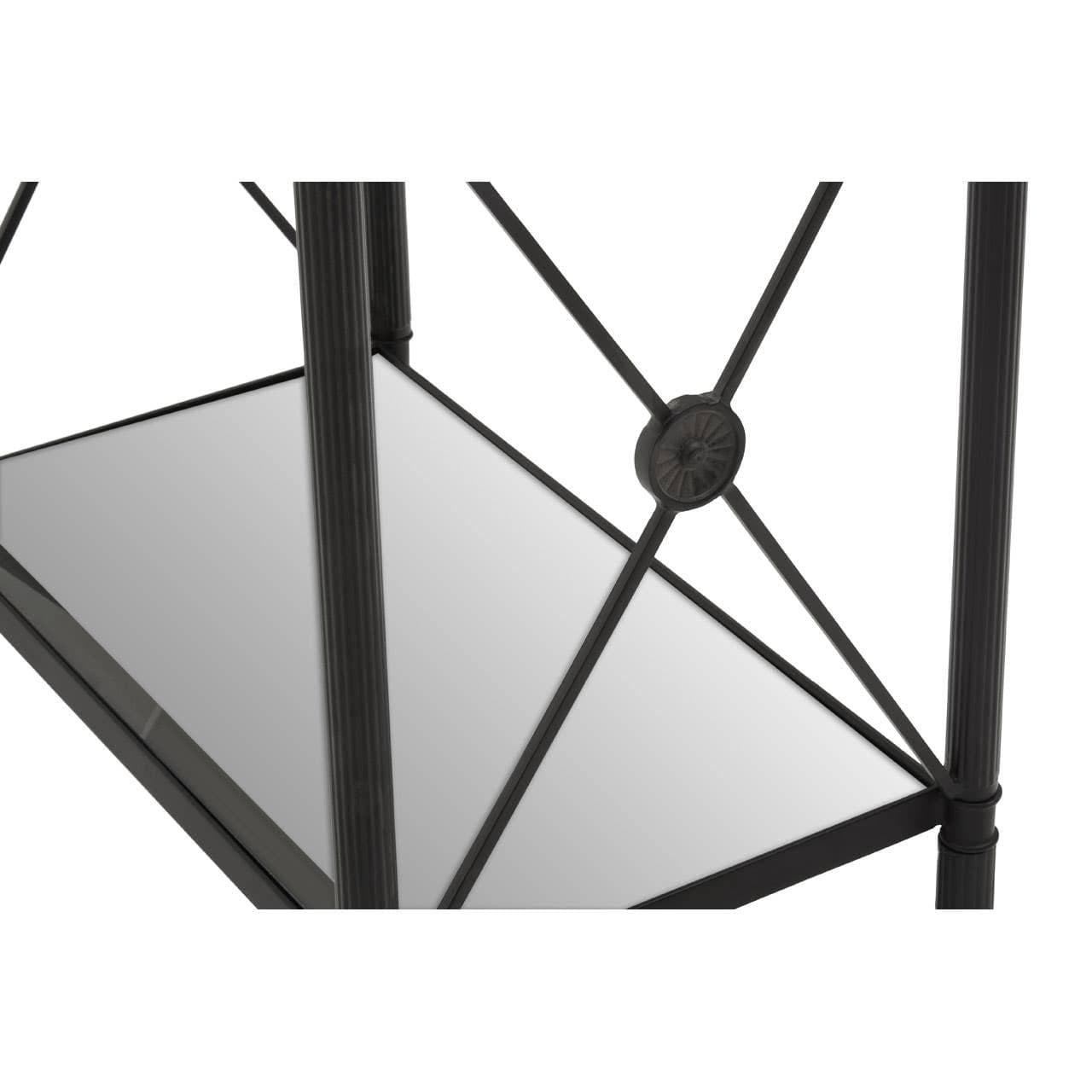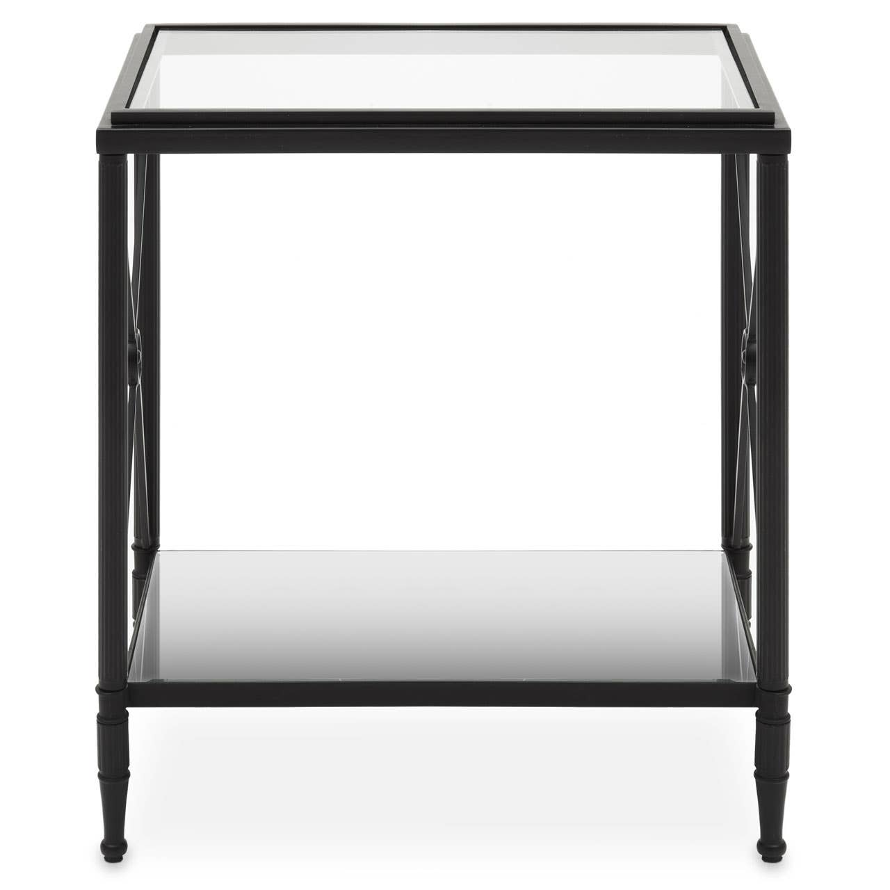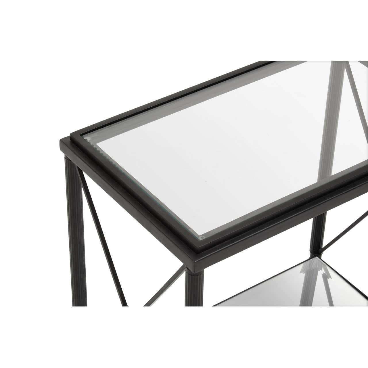 This side table has a rectangular metal frame in a black finish forming a monochrome contrast with the clear glass. Supporting two-tier glass levels, the frame features a cross design at each end which is connected with a floral motif.