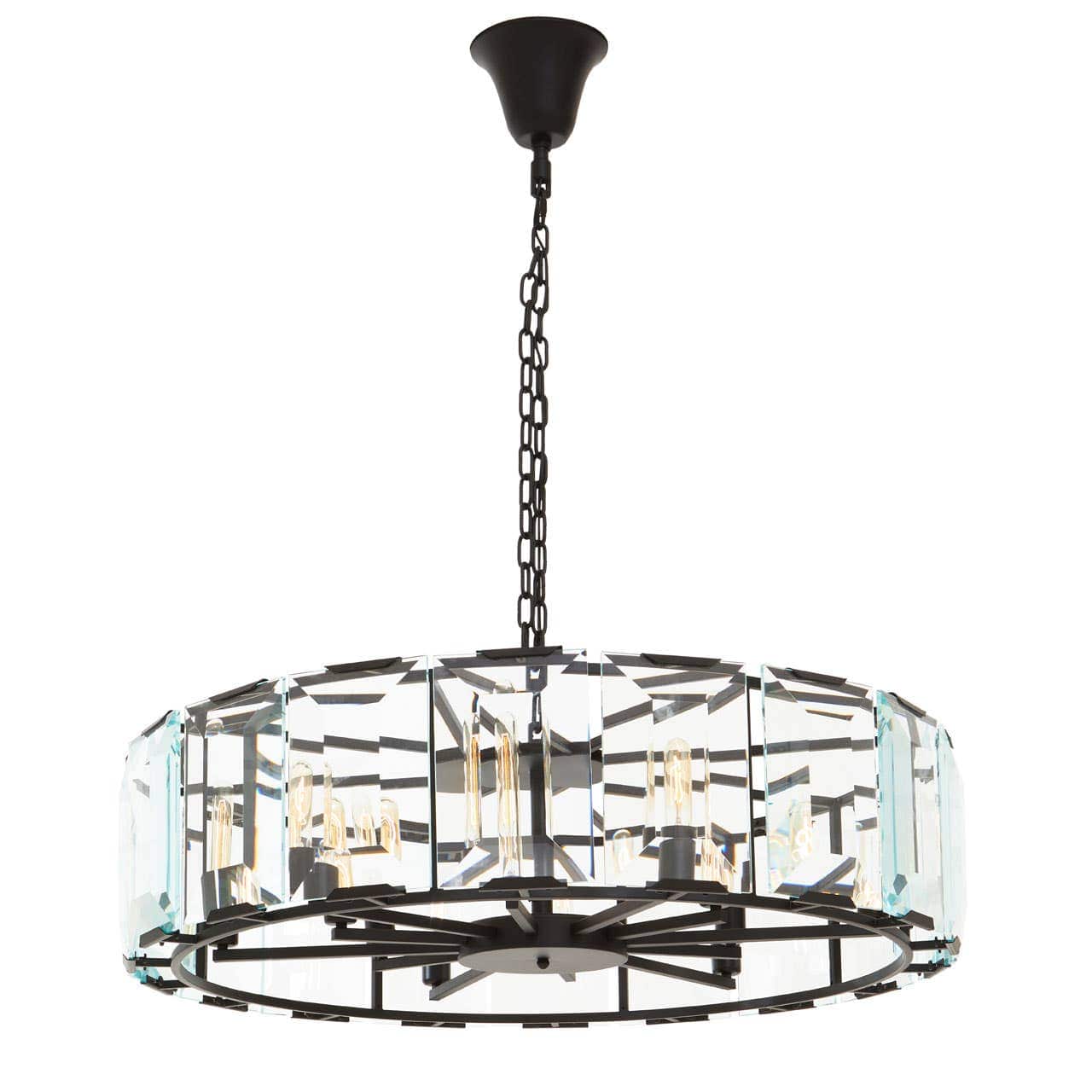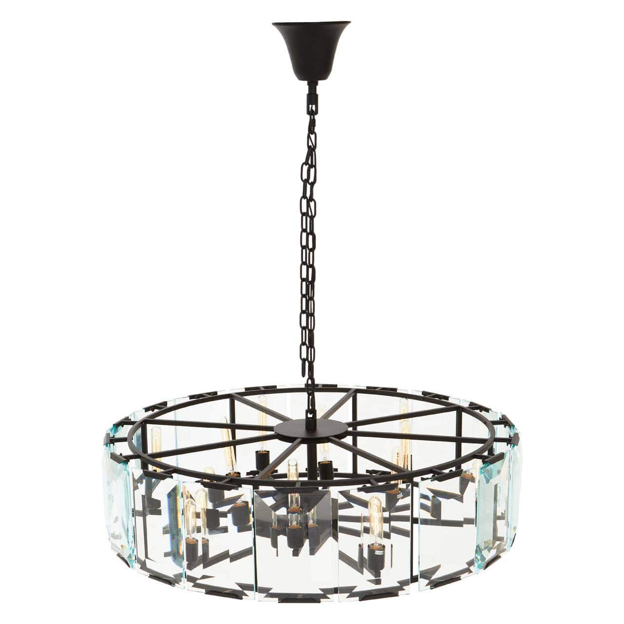 With matching, round ceiling canopy and matte black finish heightens the light airy look of the chandelier, while clear glass cylinders surround the stately silhouettes of the six bulbs, this chandelier comes 100 cm in diameter.