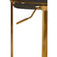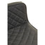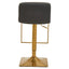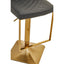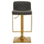 This bar stool features a dark grey leather effect padded seat with diamond pattern tufted back. Height adjustable with swivel action, the gold finish square base aligns with a minimal footrest and luxe sophistication.