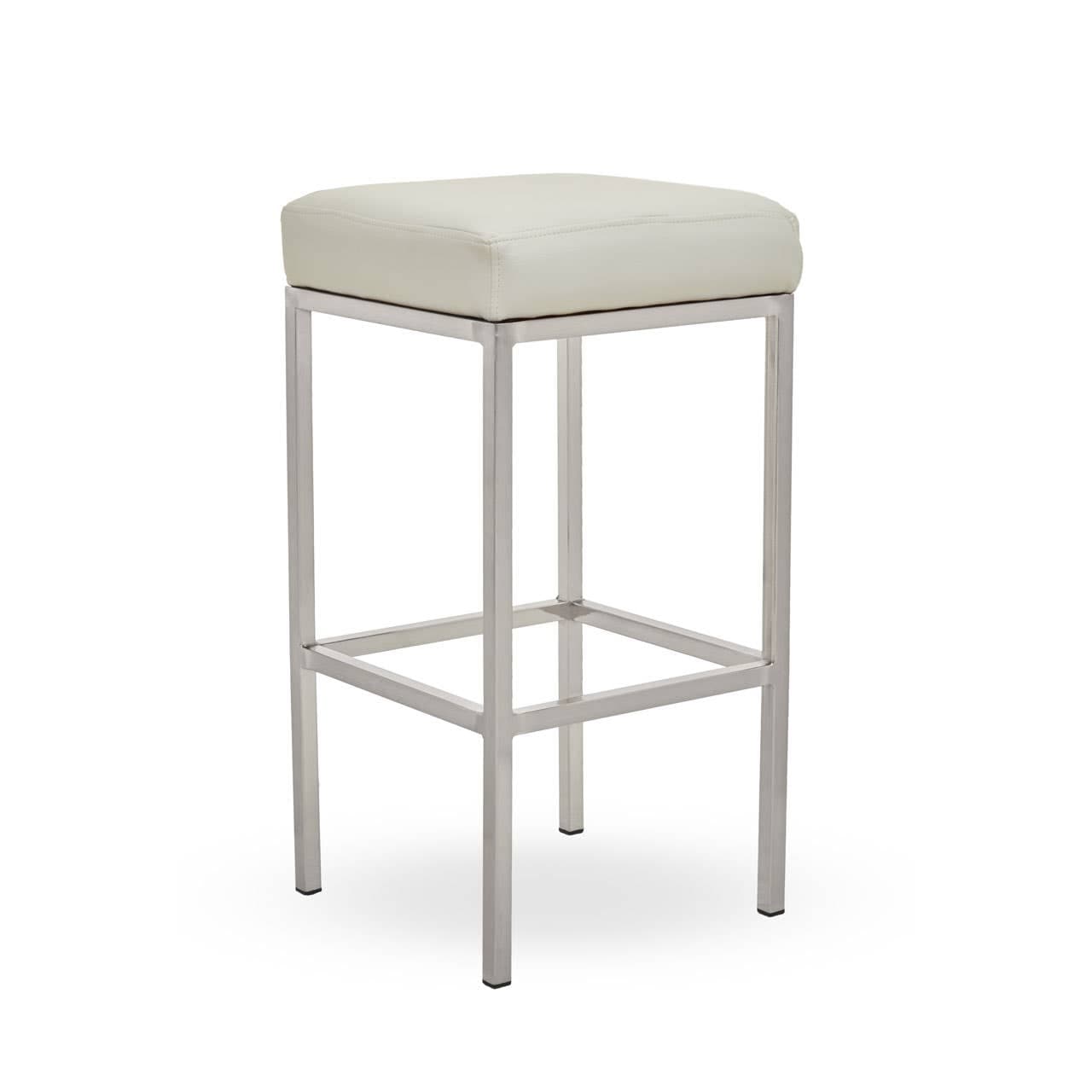 This bar stool features a square padded seat upholstered in white faux leather. Simple and elegant chrome legs and footrests elevate luxe aaesthetic and contrast chic white hues of the modern design.