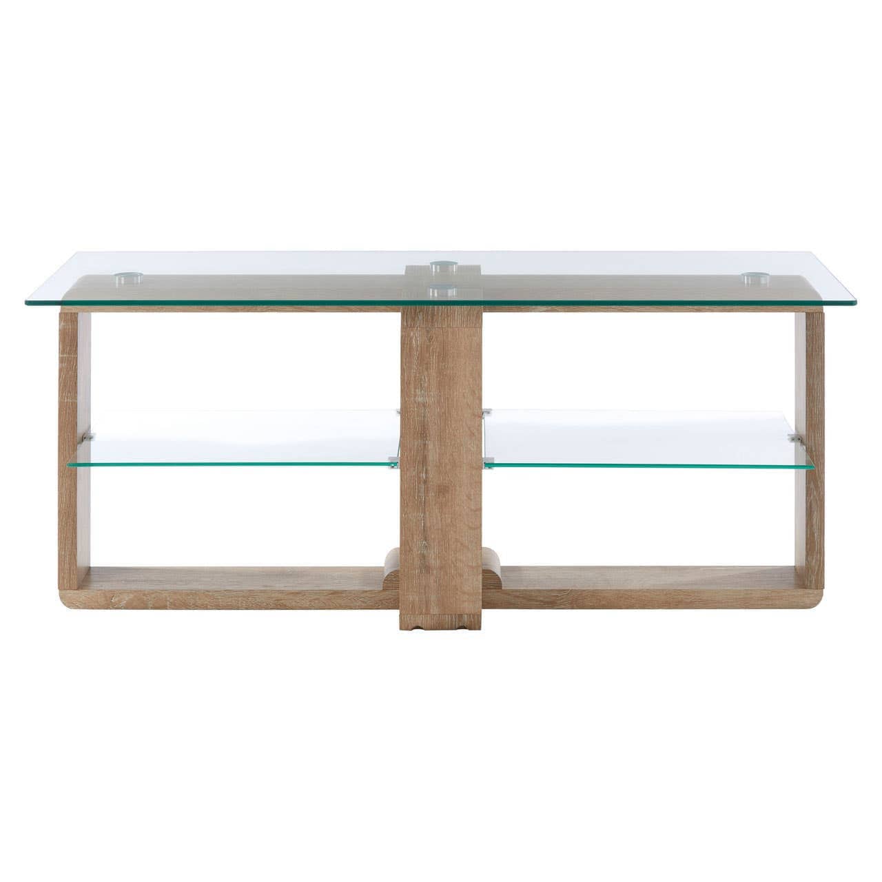 This media unit is topped with clear tempered glass that keeps the clean-lined base visible. A square glass shelf neatly sit inside each side of veneer finish base in white faux graining effect.