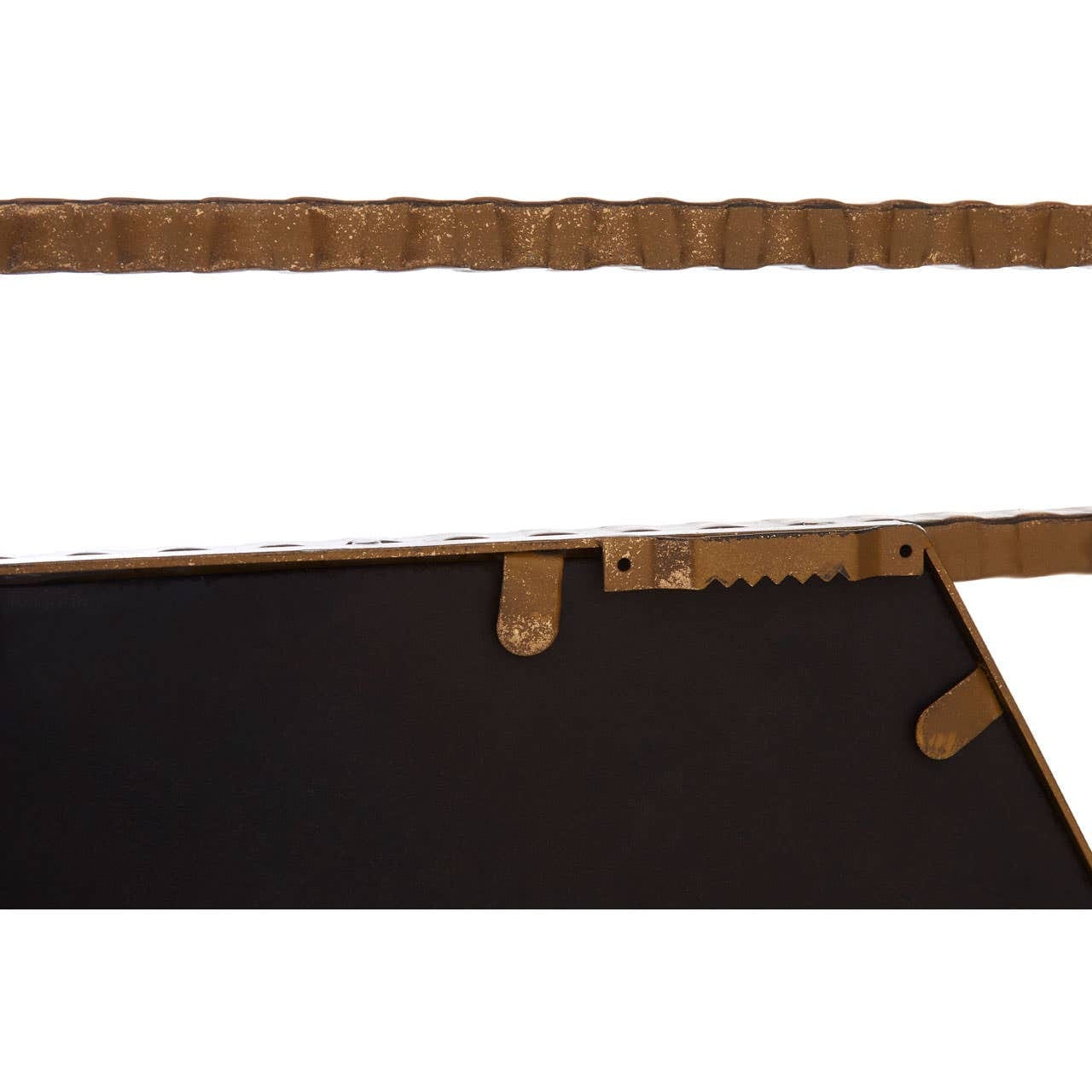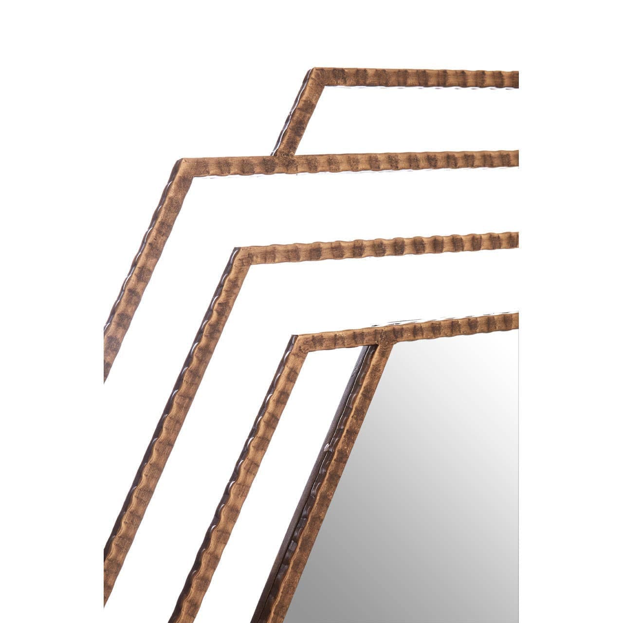 This wall mirror features a textured and sturdy metal frame in an antique gold finish. The layered hexagonal design contributes to its stylish aesthetic and makes it a distinctive geometric accent piece.