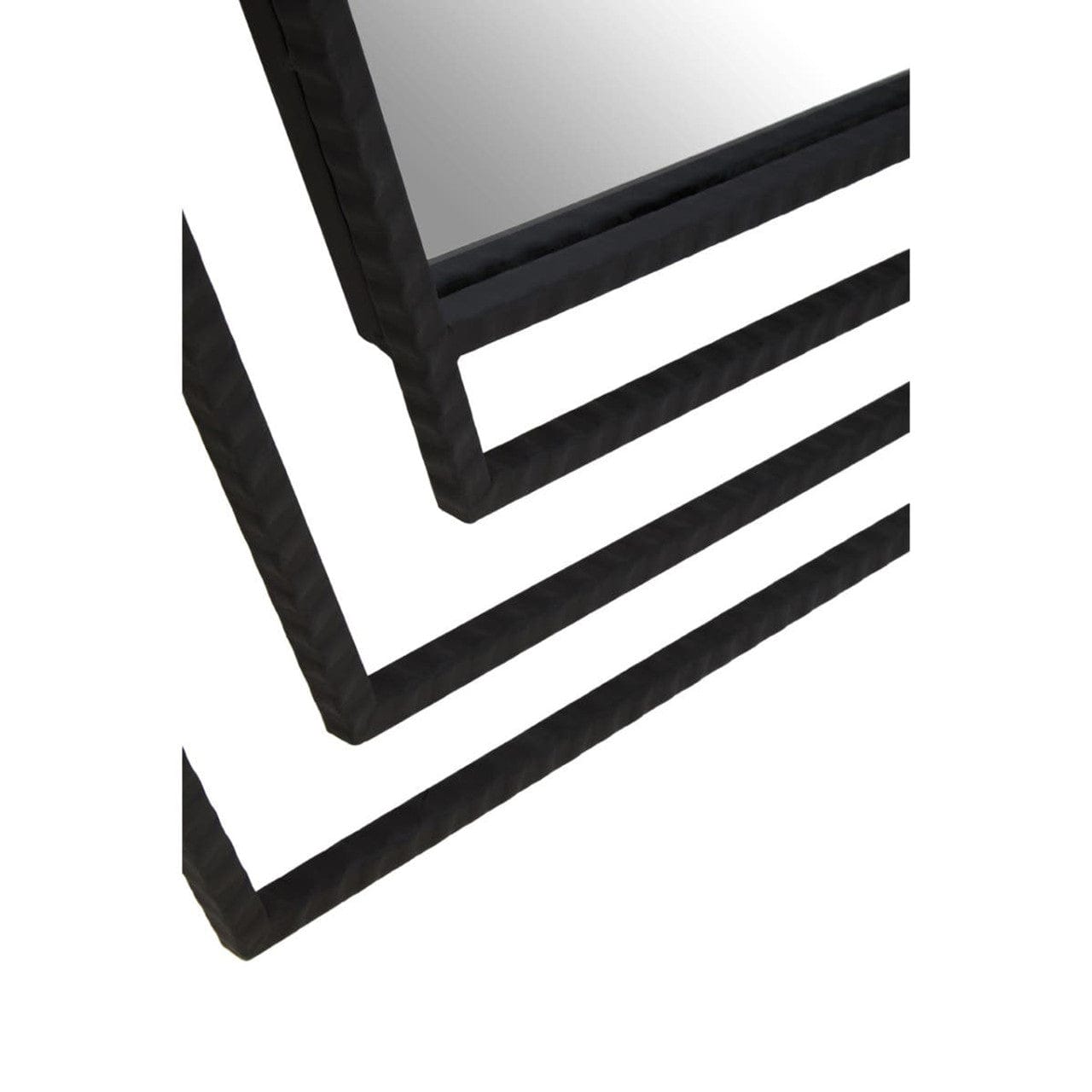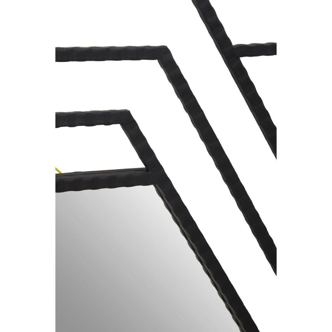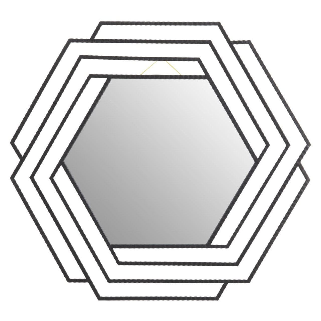 This wall mirror features a textured and sturdy metal frame in a black finish that creates visual intrigue. The layered hexagonal design contributes to its stylish aesthetic and makes it a distinctive geometric accent piece.