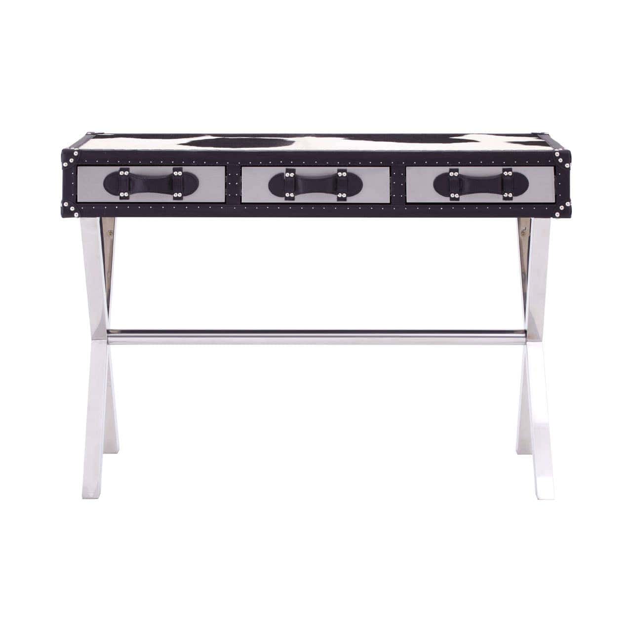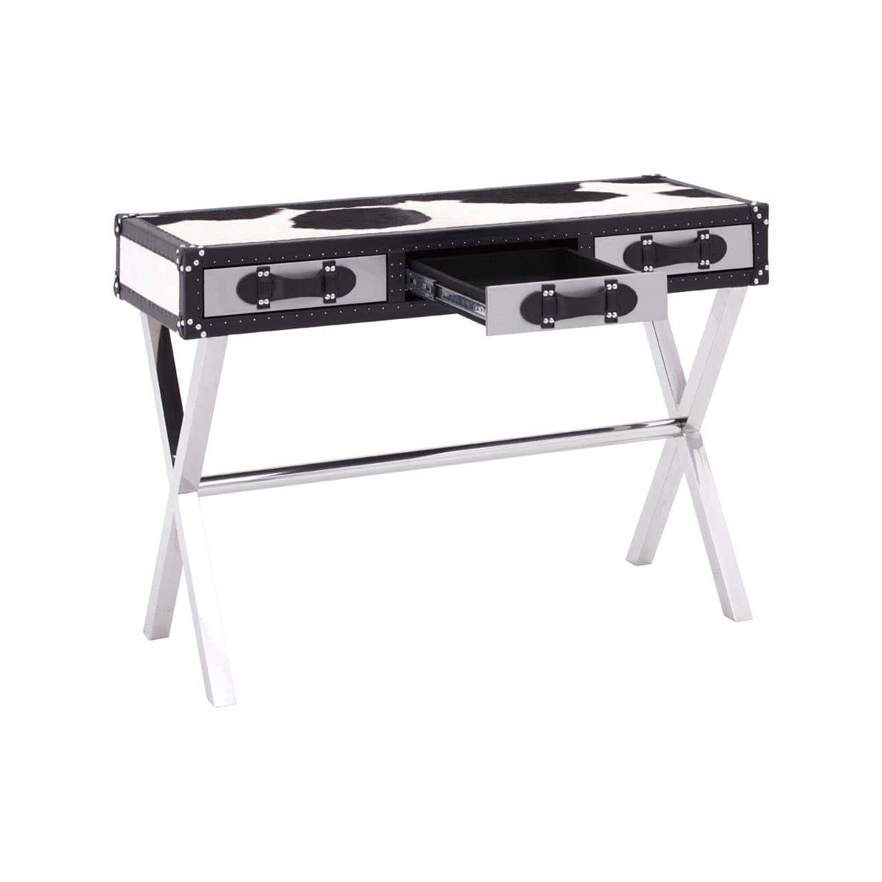 This luxury console table is supported by a cross legged stand made from reflective stainless steel, and boasts three drawers. Each drawer features a strap handle made from real leather, complementing the trim on the table's edges. Silver studs and pins introduce a metallic counterpoint to the table's tactile natural materials. *This product is made from genuine cowhide. Individual units are likely to have slightly different colours, textures, or markings from the image as this is a natural material*