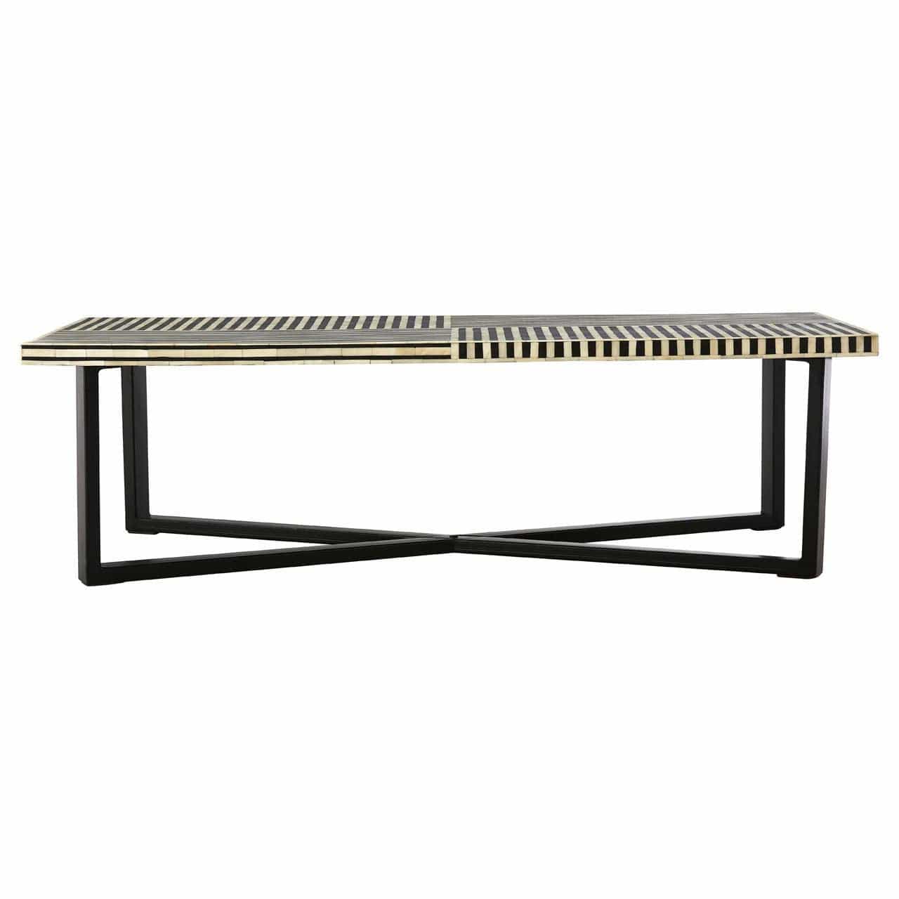 This low profile coffee table stands on black metal legs which are formed into a lattice at the base. Small strips of natural buffalo bone are inlaid into the tabletop, configured asymmetrically over four quarters.