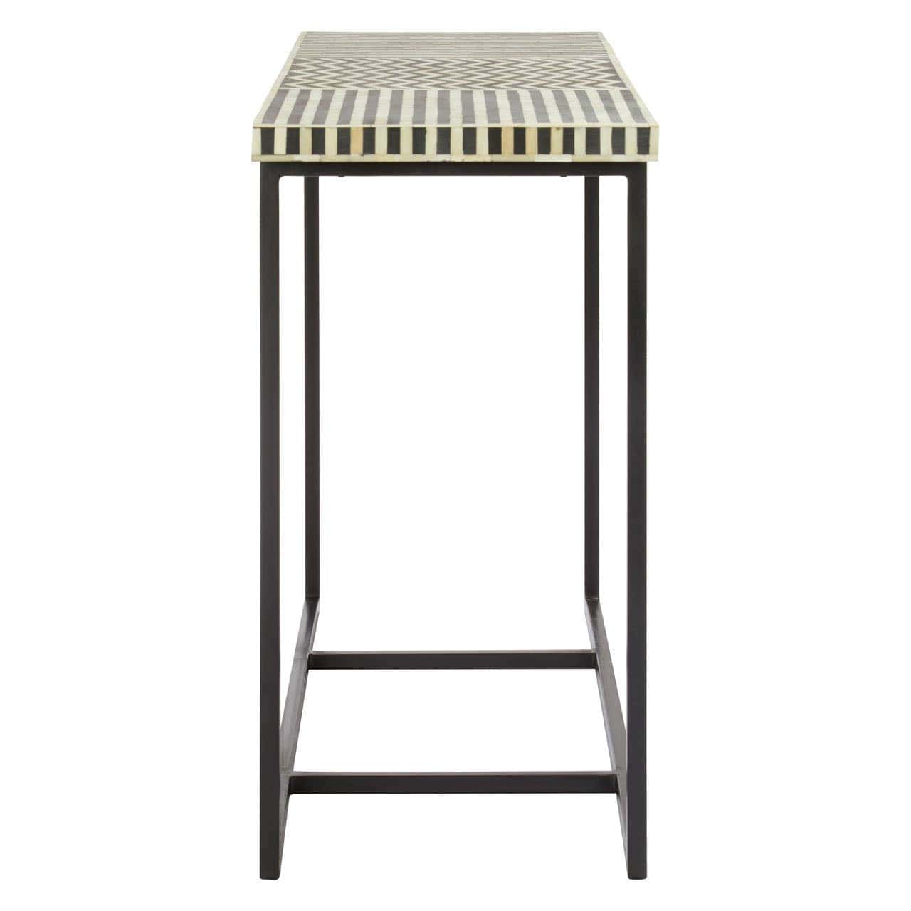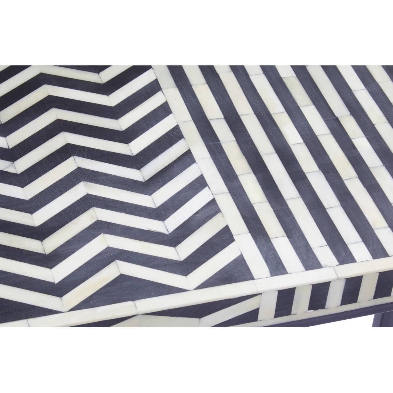 Boho and travel go hand in hand and the Boho bone inlay console table is no exception to luxury and style. The black supporting metal legs hold up the renewable Mango wood which is smooth and sleek to the touch. The zig-zag and straight-lined design is detailed using bone inlay. This is all finished in a black and white design which is simple yet effective in luxurious lifestyle interiors.