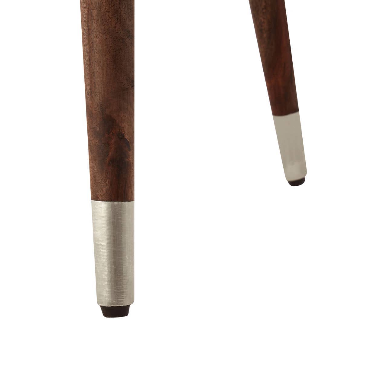 The three legs of the Boho Carve side table are made from sheesham wood, which is notable for its rich tone and close grain. Metal plate wraps around the end of each tapered leg, coordinating with the silver-coloured finish of the table surface. Tribal-inspired embossed patterning adorns the surface of this beautiful table.