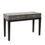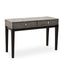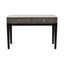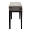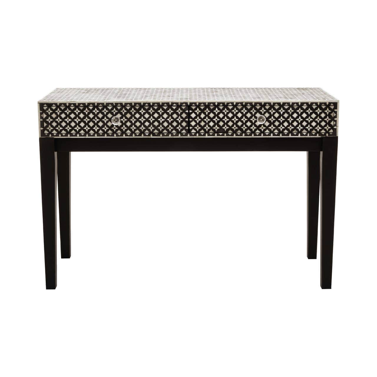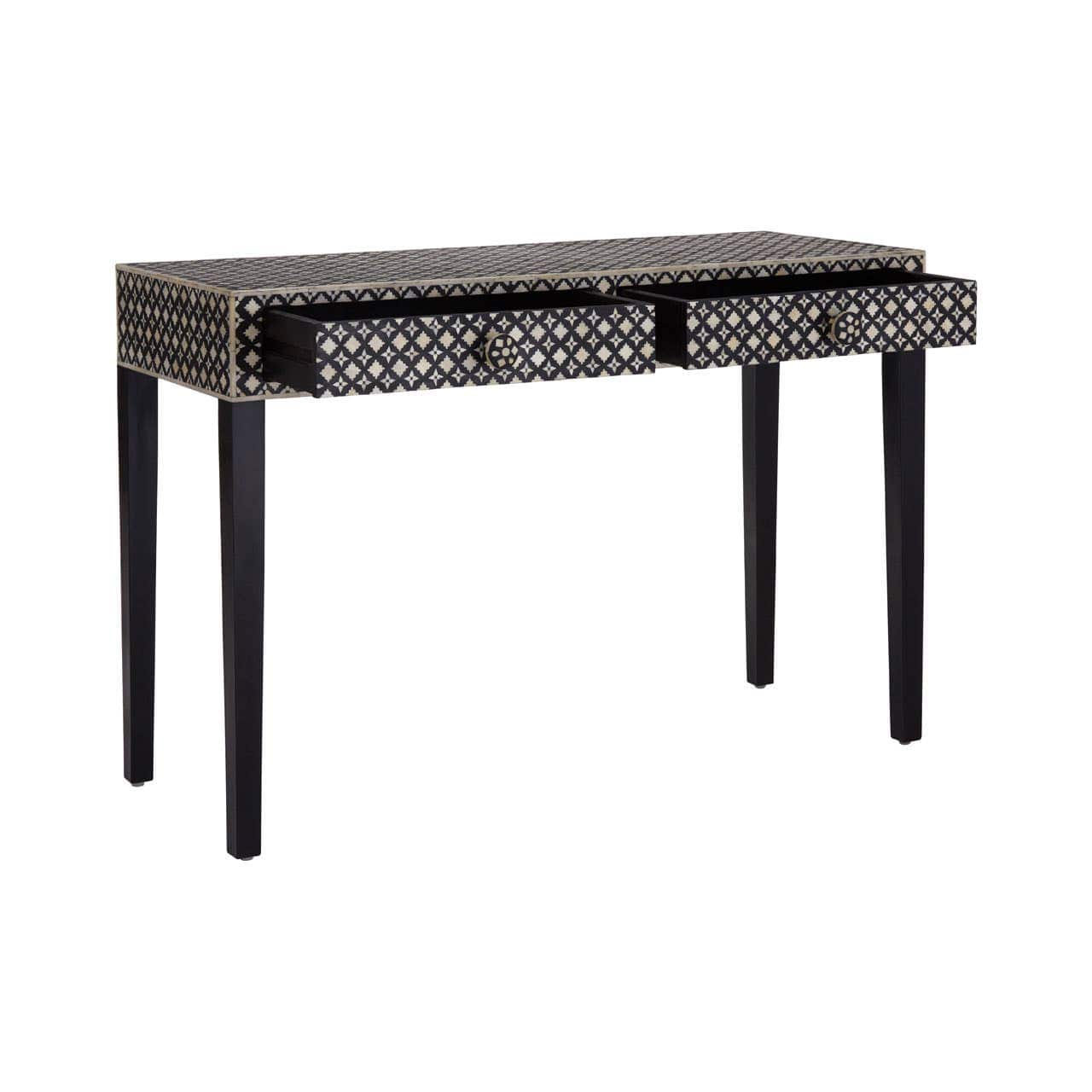 Inlaid with mother of pearl, the Boho console table's black and cream tones bring monochrome to the living room. The exotic patterning on the console table's smooth surface extends to the handles of the two useful drawers. Its slim black wooden legs have floor protectors that prevent scuffs and scratches.