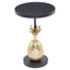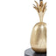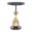 The stand out feature of this table is the antique brass coloured pineapple that rests at the base. Associated with hospitality, its reflective finish contrasts with the black iron base and stand. The pineapple has a diamond pattern surface that complements the elliptical etching on the base. Luxuriously boho, it incorporates a round iron top into the design.