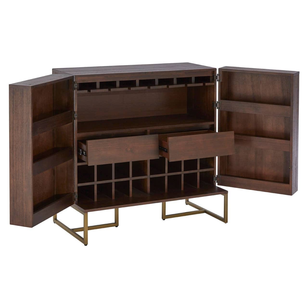 This drinks cabinet exudes sophistication with an acacia wood veneer body and a herringbone engraving on its front doors. The two door handles and the leg frame come in a sleek antique brass finish that complements the dark tone of acacia wood veneer. Inside, the cabinet offers dedicated storage including stemware racks, an open shelf, two central drawers, and a lower wine rack with multiple compartments for bottles, with additional shelving racks on the inner side of each door for extra storage.