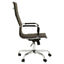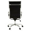 This high-back executive chair's contemporary lines enhance any modern office setup. It features a one-piece molded seat and back with bonded leather cushions. It is upholstered in black leather effect fabric supported by a chrome base.
