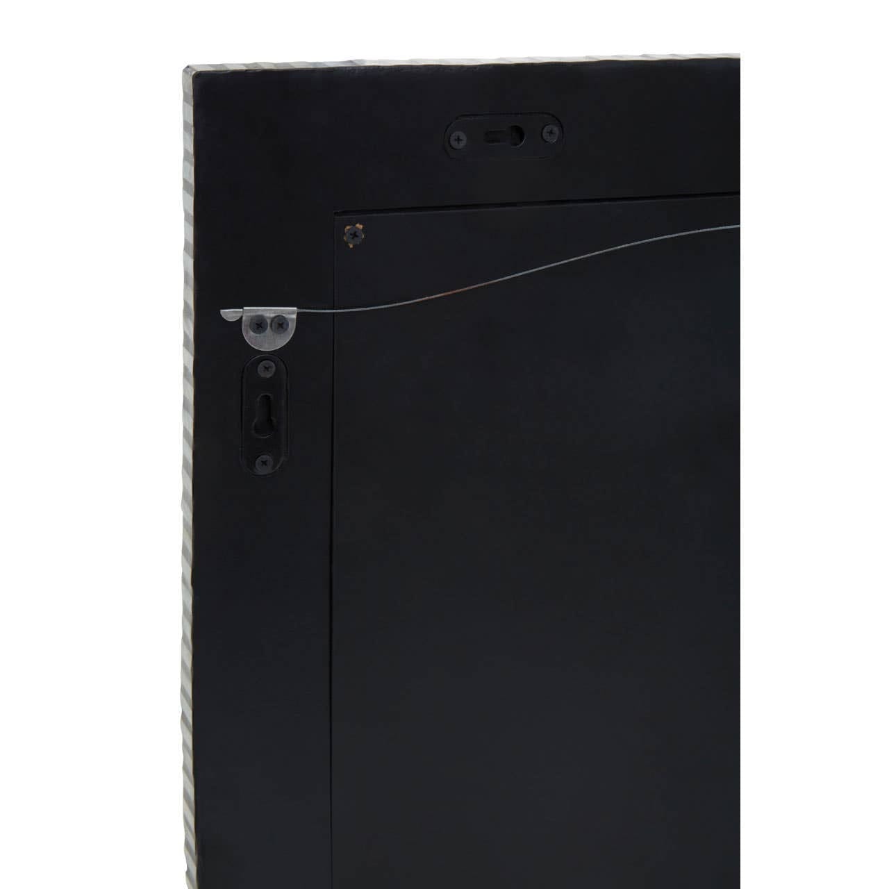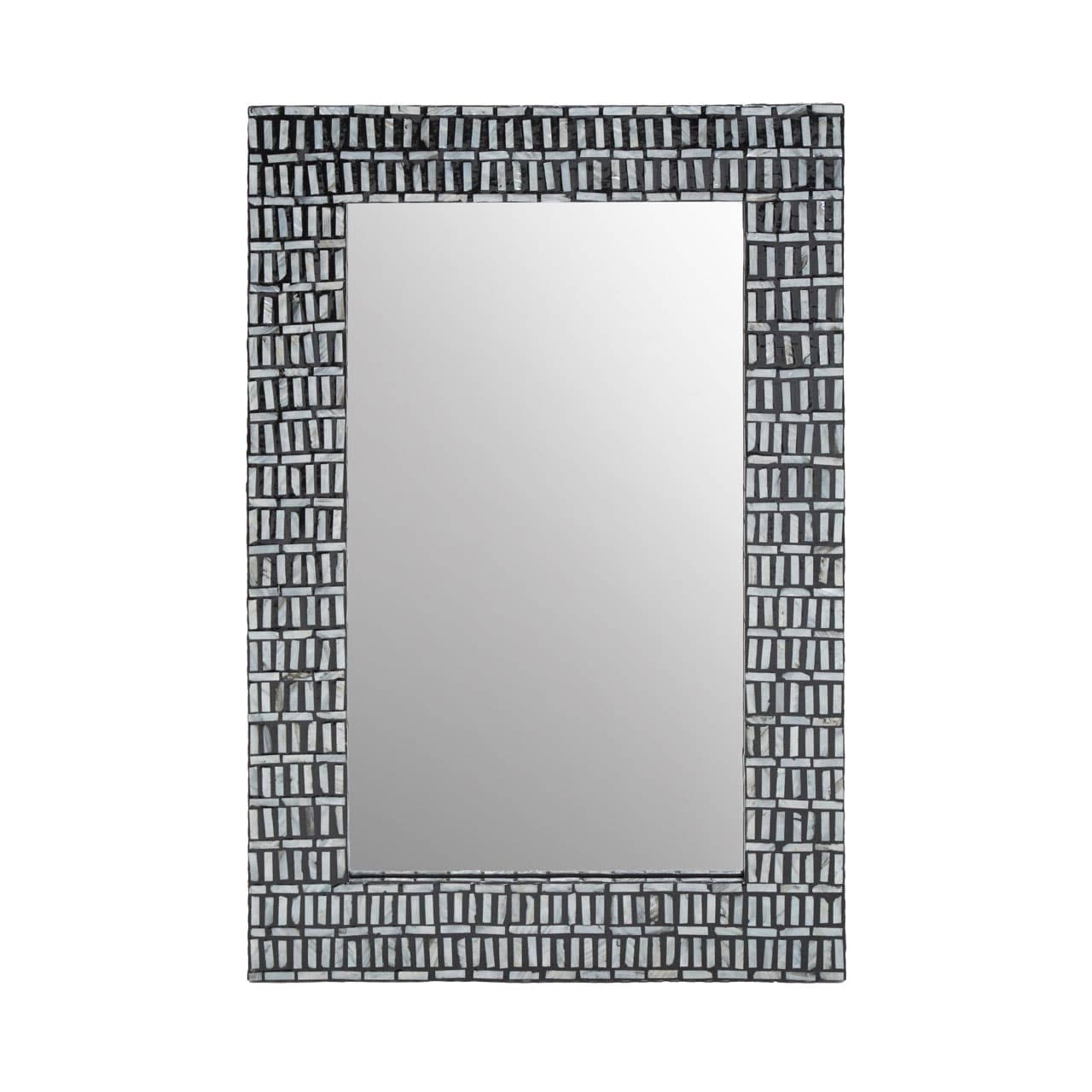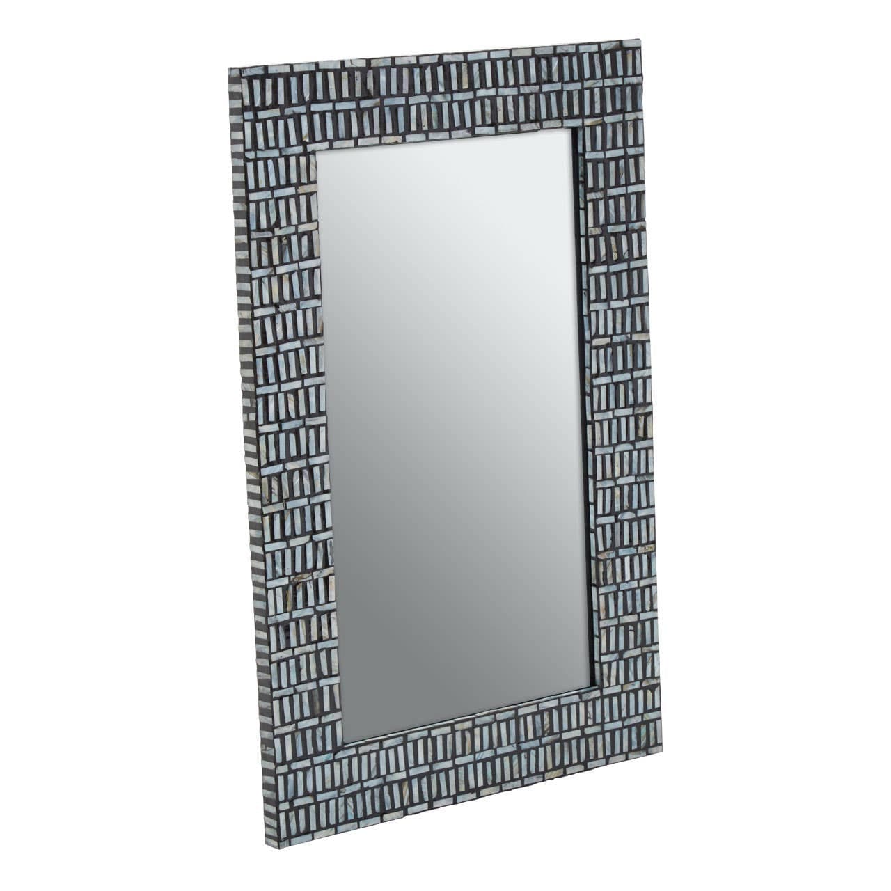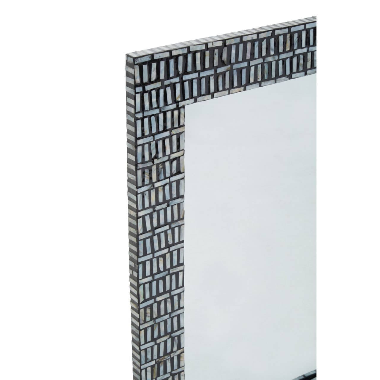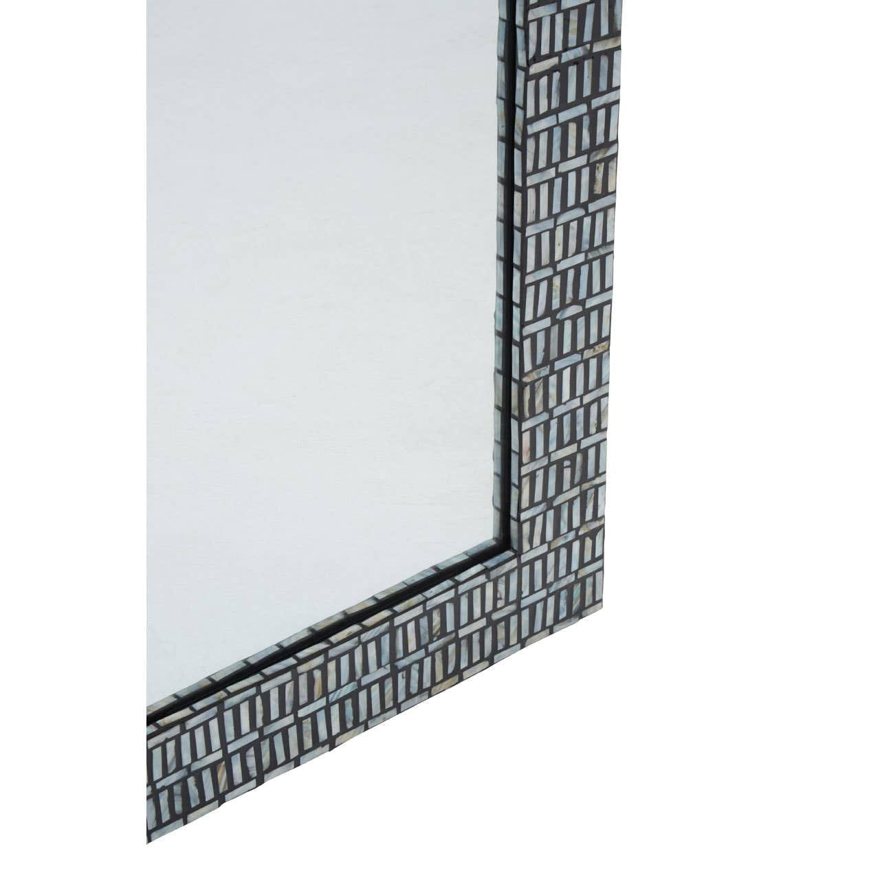The Bria striking rectangular wall mirror features a wide, decorative frame meticulously crafted with a shell inlay. The frame showcases a captivating pattern of alternating light and dark rectangular pieces, arranged in a mosaic design, creating a visually rich frame that adds a unique, handcrafted touch to any space.