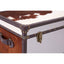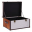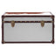 The trunk's edges are trimmed with real leather that has a brown colour which complements the brown and white cowhide. Stainless steel stud detail introduces a reflective metallic accent to the earthy palette. Silver coloured studs secure the natural leather handles on each side, while the lid is held in place with chunky hinges and latch locks. *This product is made from genuine cowhide. Individual units are likely to have slightly different colours, textures, or markings from the image as this is a natural material*