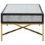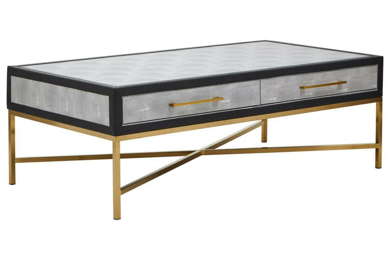 This sleek and contemporary coffee table is made from black and brown oak and features geometric brass panels across the drawers, and is supported by sturdy gold finish stainless steel linked legs.