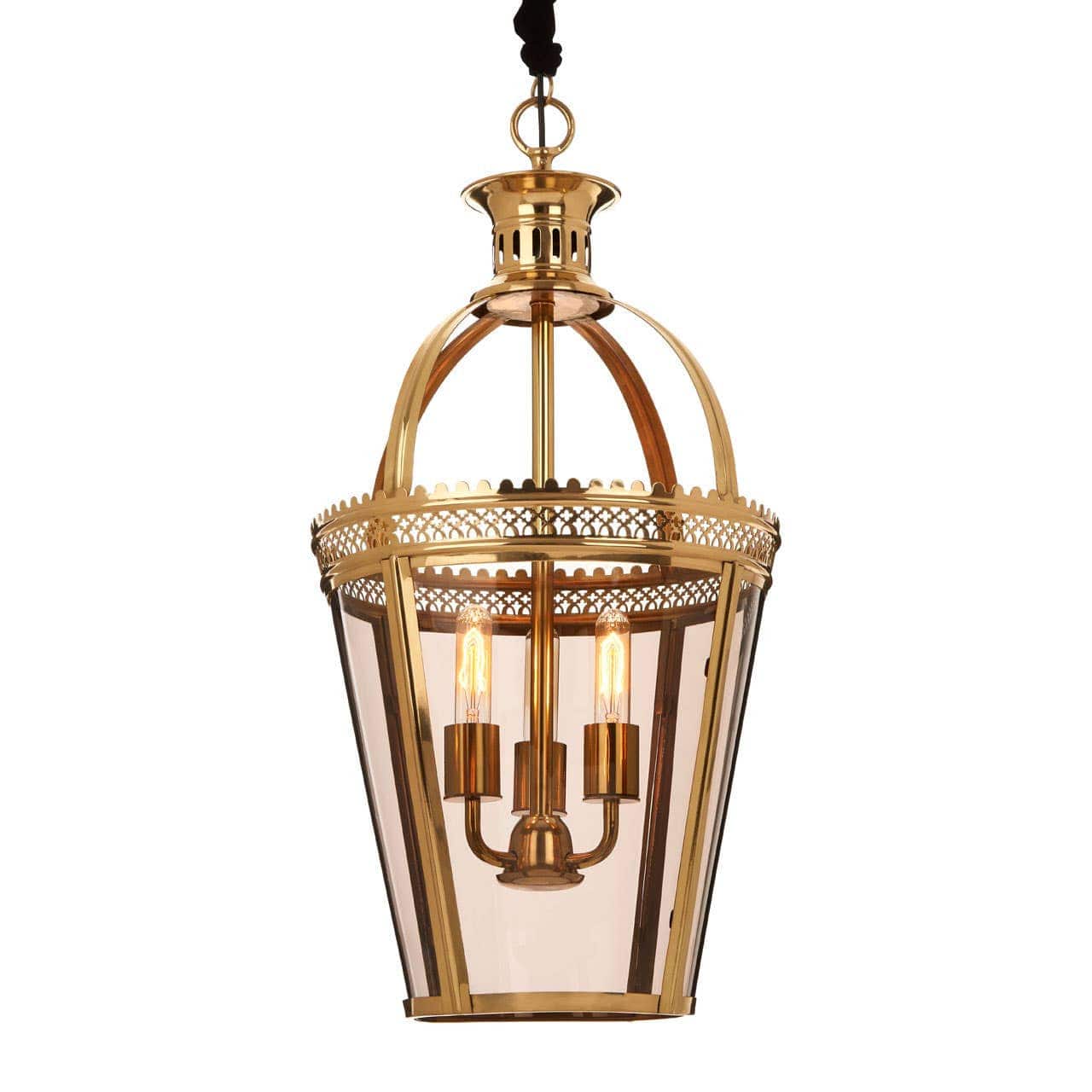 The shade is made from metal and displays a number of decorative features, including intricate lattice detail, dome lines at the top, and a hurricane-style finial. It sports a rich brass finish that styles well with warm metallic tones.