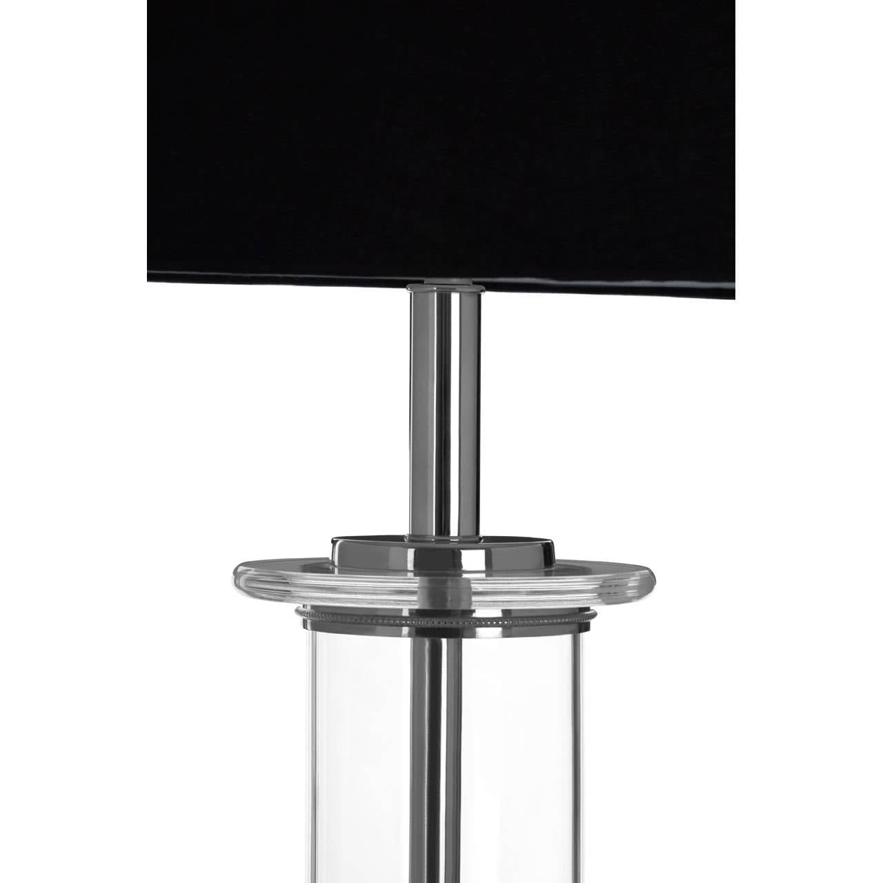 The base and stand of the Camile floor lamp are made from brass and boast a nickel coating for a reflective finish. A clear acrylic cylinder covers the stand, and features nickel finished rings at sequential points. The shade is made from soft fabric and coloured black, giving the lamp a monochrome look.