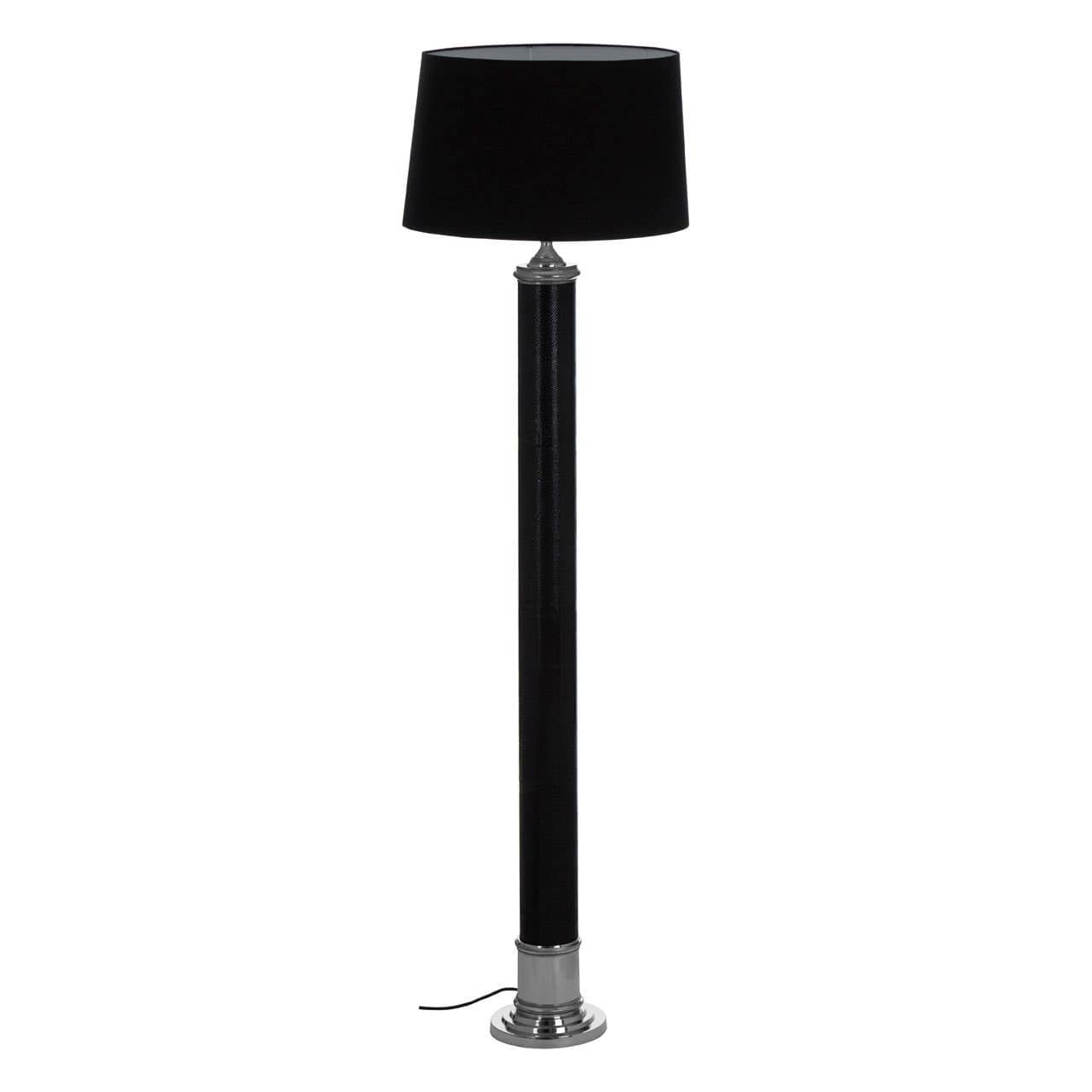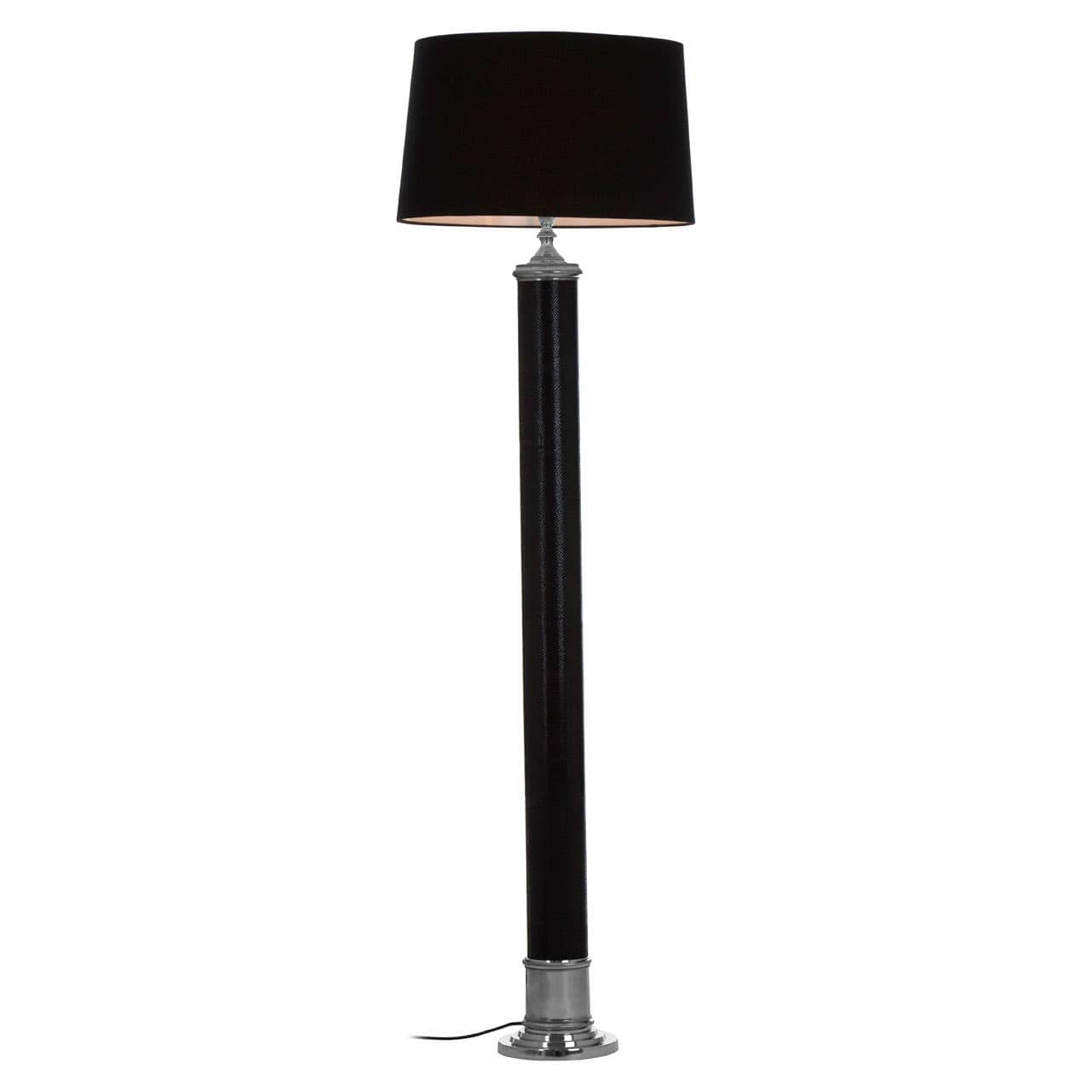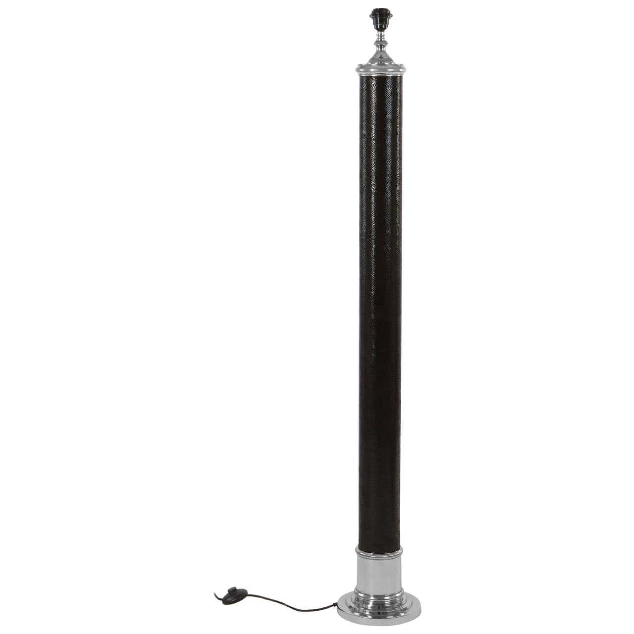 The stand of this handsome floor lamp is made from metal and is wrapped in tactile black leather. The reflective base is stepped, and features subtle etched detail, with a matching pattern in the stem beneath the shade. *Please note, shade is not included.