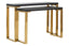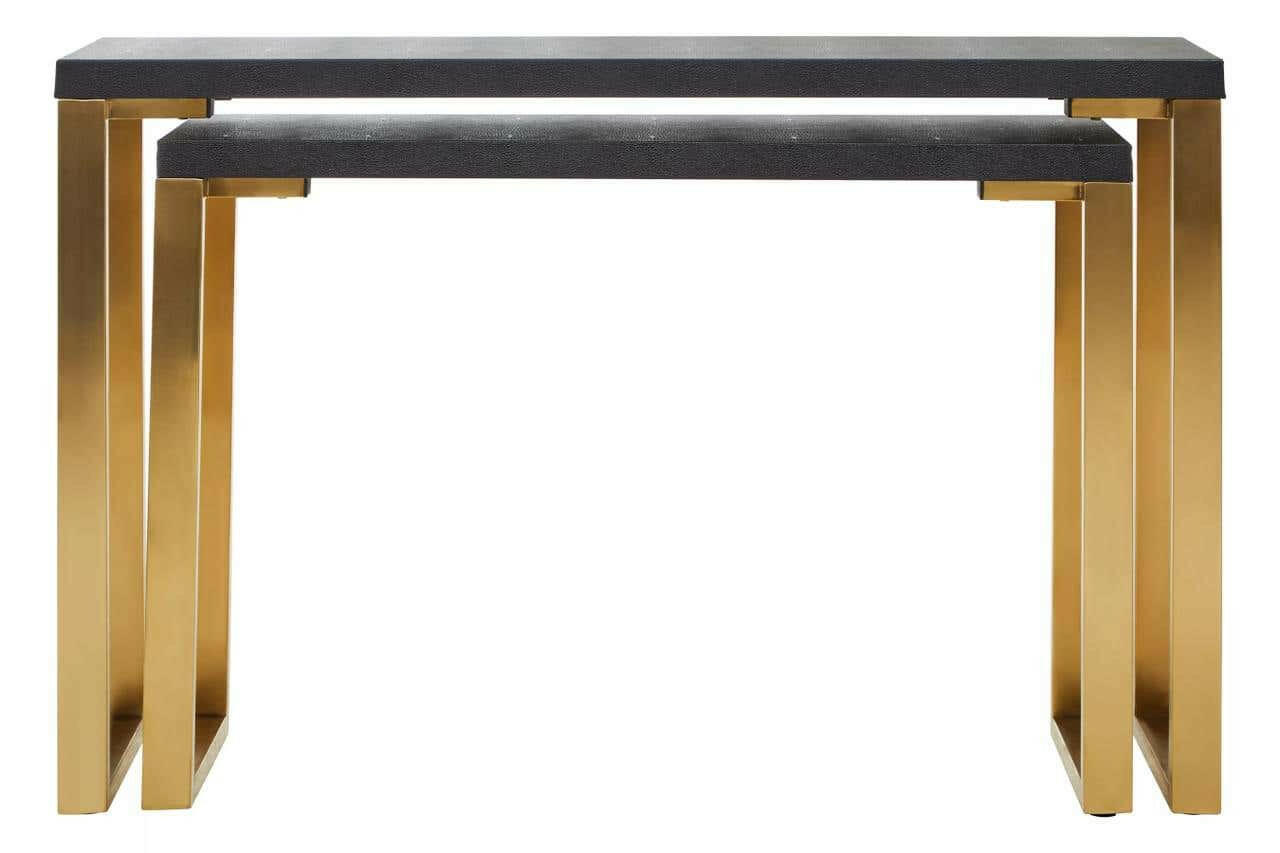 This set of two tables have rectangular tops layered with natural shagreen in a distinctive texture. The solid brushed matte gold legs add a modern and sophisticated touch to the tables.