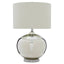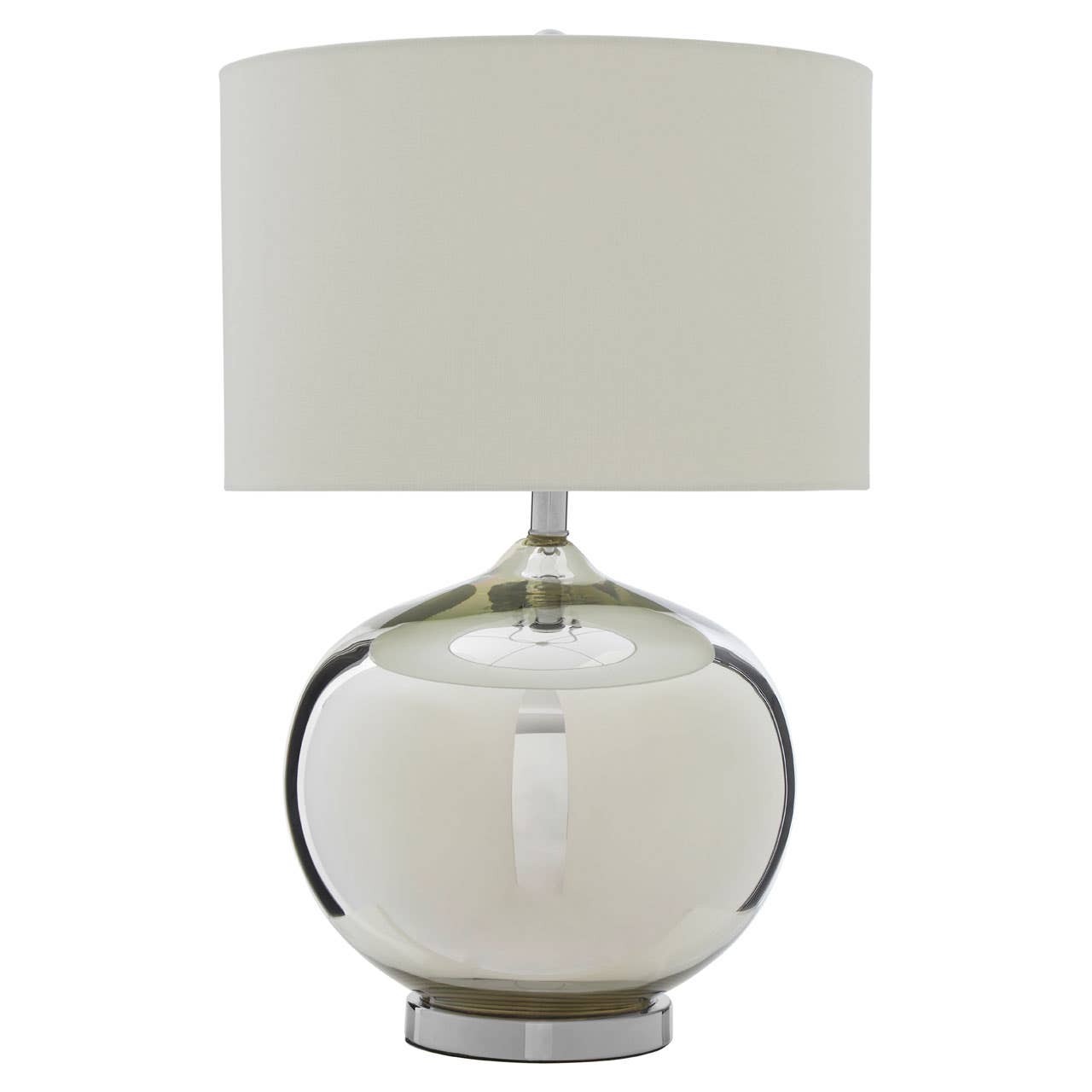 The Carson table lamp has a ball shaped glass stand that boasts a metallic finish that adds a luminous effect to its surroundings. The chrome finish base complements its high gloss outer surface and gives this lamp minimal metallic appeal. A white fabric shade counterpoints reflective aesthetic of this traditional style lamp with its soft, muted aesthetic.