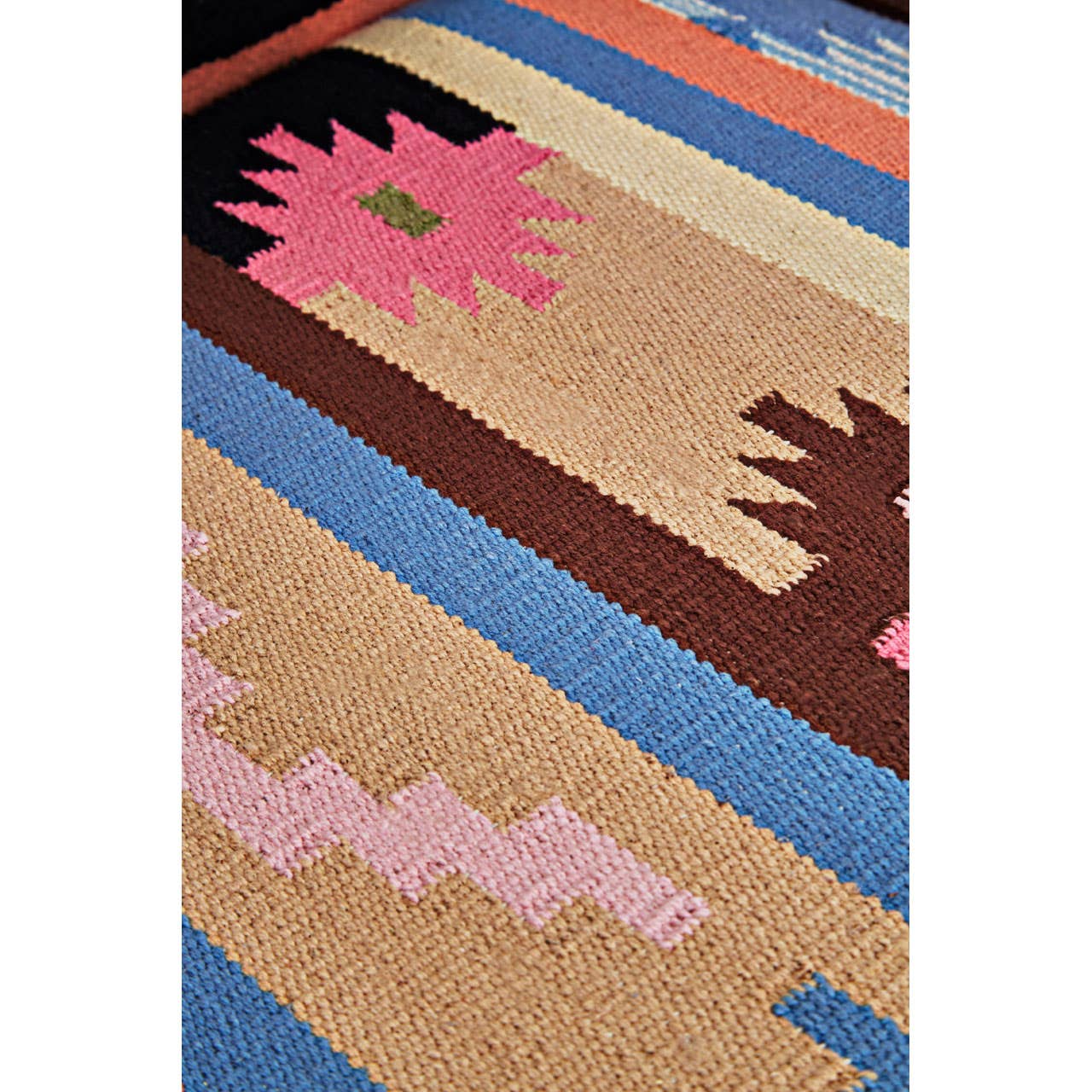 The Cefena chair has geometrical and multi-coloured upholstered motifs and patterns. The sledge-shaped legs are made from eco-friendly mango wood and have a natural brown finish.