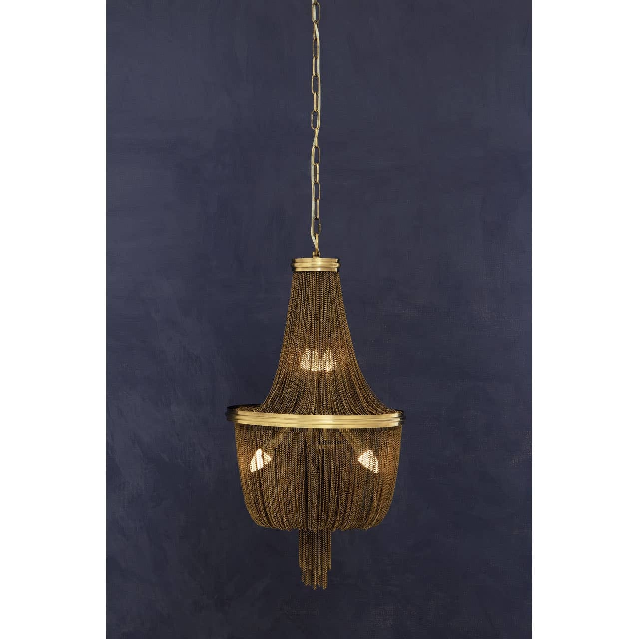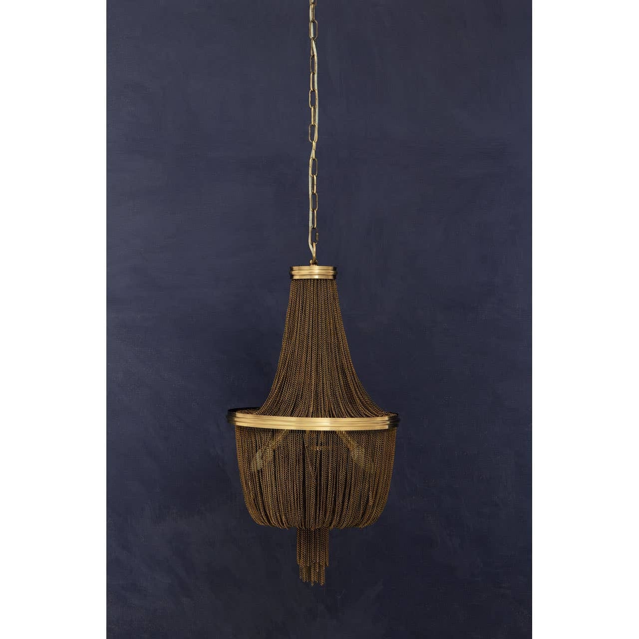 The Chain chandelier brings timeless elegance and sophisticated ambience to the dining room. Complete with six bulbs in the frame, this piece exhibits a warm glow in the living area with its gathered veils of metal chains in antique brass finish.
