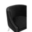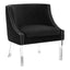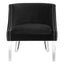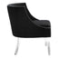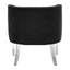 The Clarence chair boasts a stylish design with sloped armrests and curved backrest, coordinating with the arched rear legs. Upholstered in black velvet fabric, the chair has a luxurious appeal suitable for luxe style interiors. Silver finished stud detailing lines the edges of the arm and back rests, adding a cool metallic accent.