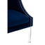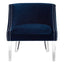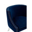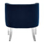 The Clarence chair boasts a stylish design with sloped armrests and curved backrest, coordinating with the arched rear legs. Upholstered in rich blue velvet fabric, the chair has a luxurious appeal suitable for luxe style interiors. Silver finished stud detailing lines the edges of the arm and back rests, adding a cool metallic accent.