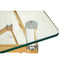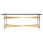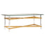Four cylindrical, clear acrylic legs support the Clarence coffee table's substantial top. The transparent appearance of the tempered glass top complements the legs and creates a contemporary look. Two metal cross designs connect the four legs with a reflective gold finish lending them luxurious appeal.