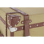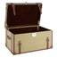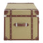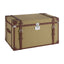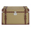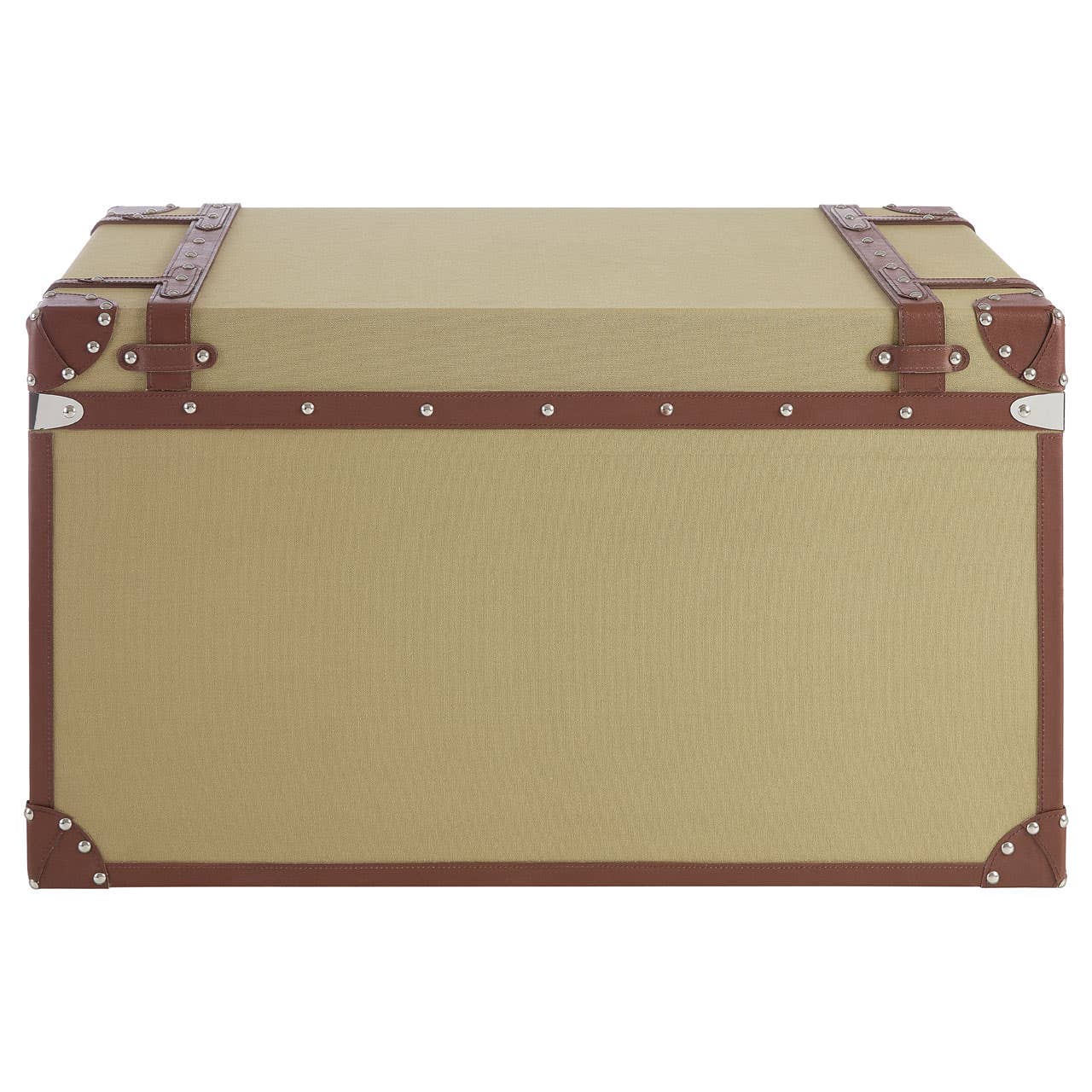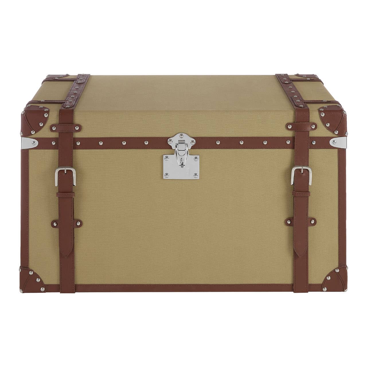 The rectangular trunk is made from eco-friendly mango wood, and is dressed with canvas to give it a textured finish. The genuine leather is coloured dark brown to complement the canvas and features silver coloured stud detail. Genuine leather strap handles decorate each side, while the lid is secured with a silver metal clasp lock.