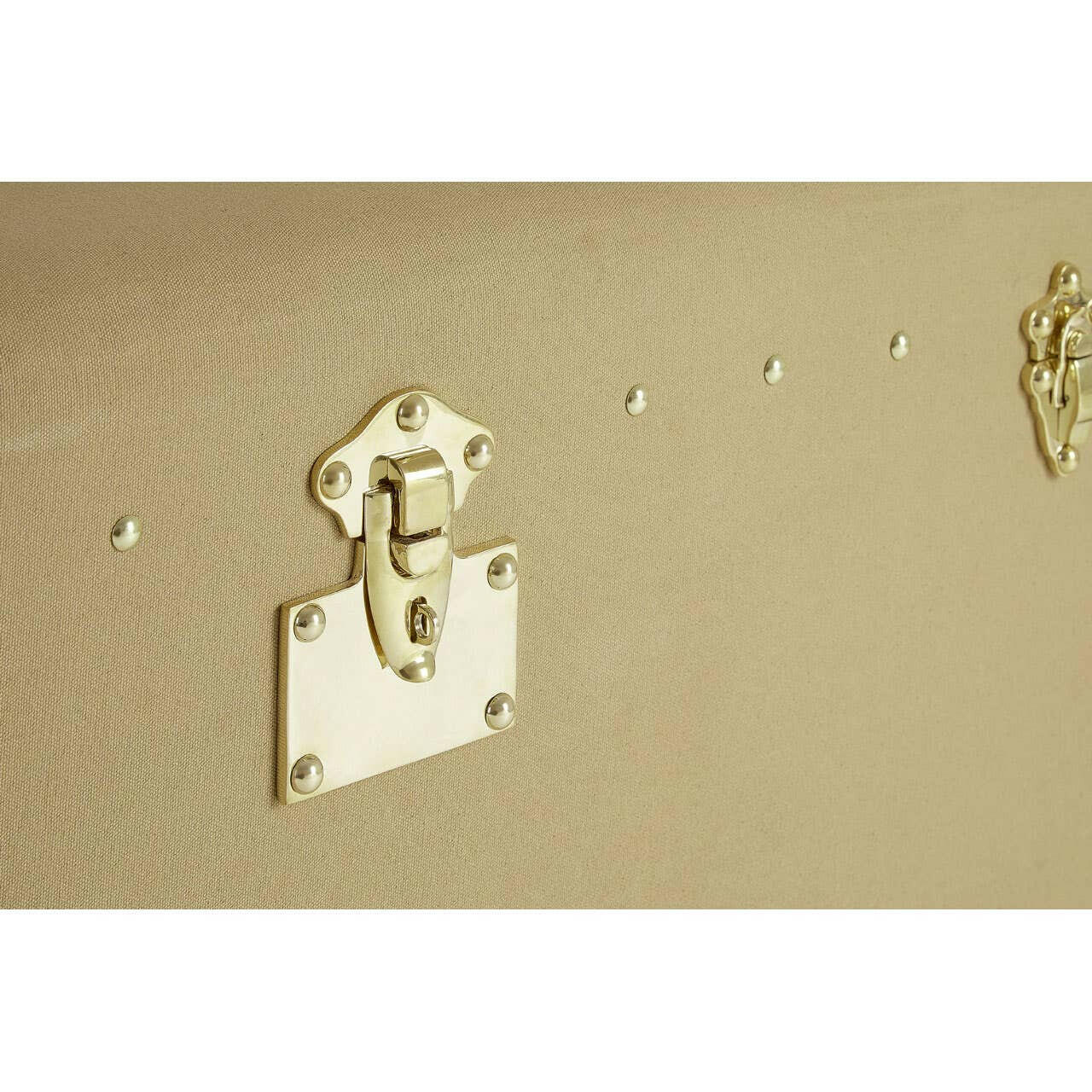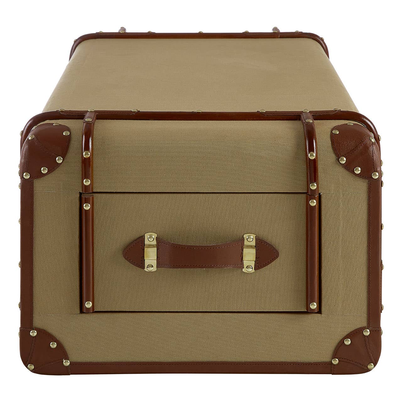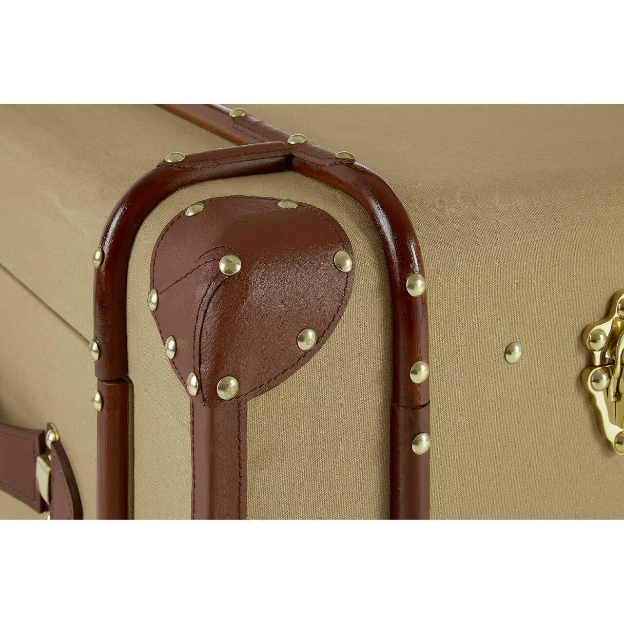 Its case is made from eco-friendly mango wood and is covered with textured canvas. The canvas has a natural colour that complements the brown, genuine leather detail at the corners and sides. Its side drawers feature coordinating leather handles, while the stud detail complements the metal clasp locks that secure its lid.