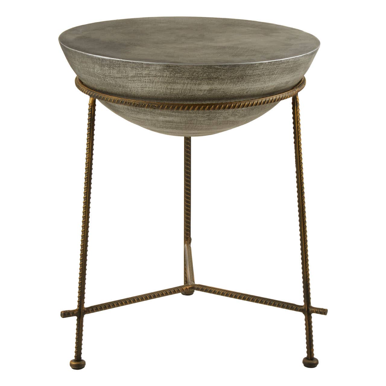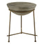 The Compo end table features a three-legged base formed from strong iron. The base is textured with small ridges and boasts an antique brass finish that lends the end table a weathered aesthetic. Supported by the base is a hemisphere tabletop that is created from richly-textured concrete, with an antique silver finish to harmonise with the finish of the unique base.