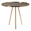 The Corra side table is made of iron, and balances a round top on a trio of slim legs. A piece of mirrored glass is set into the top.