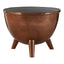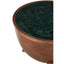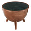 The Crest table has a distinctively rotund, drum-shaped design. It's made from tough iron, and its copper surface has a slightly distressed finish that lends it character. A copper coloured band trims its top section, into which a slab of natural green marble is set, notable for the whorls and swirls that traverse its surface.