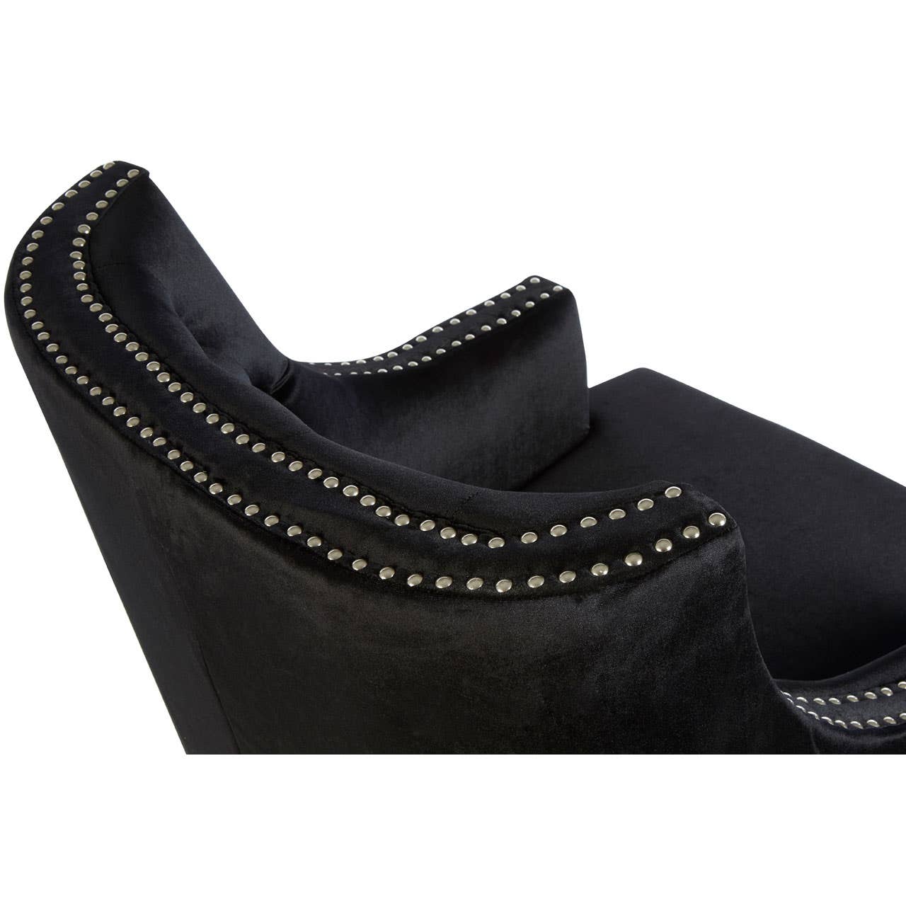 This chair makes a sophisticated impression thanks to its chic black velvetupholstery. Its high, curving back references traditional approaches to design, amplified by the deep button tufting that forms a comforting quilt pattern. The silver coloured studs trace the curve of the arms, adding a reflective touch to this statement piece.