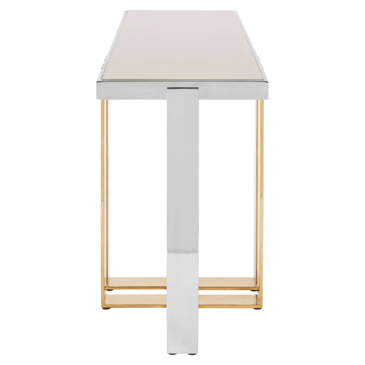 Its rectangular top is made from frosted glass to provide the design with a touch of translucence. The minimal stainless steel frame does not impose on its surroundings, and has a silver finish to contrast with the large gold coloured metal lines.
