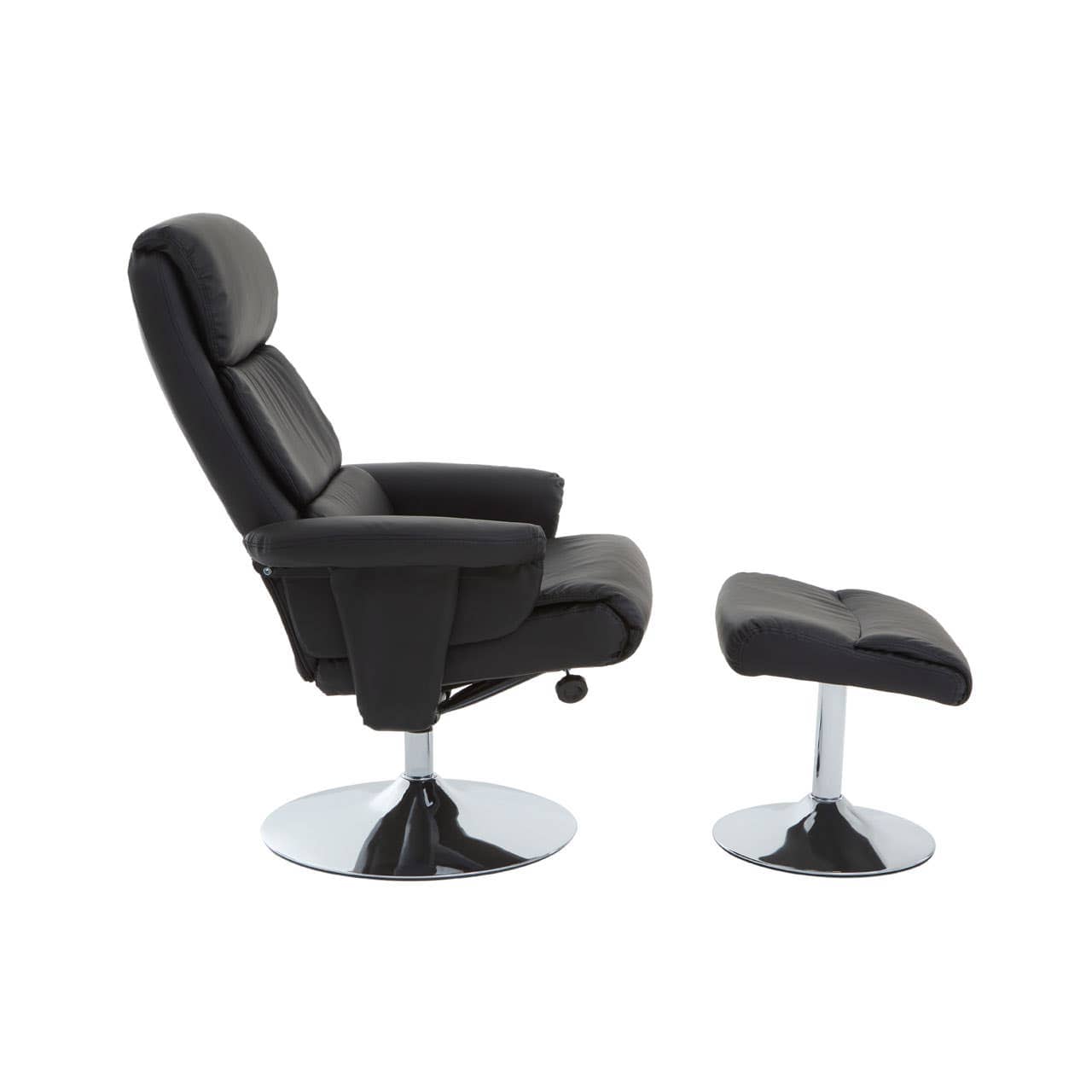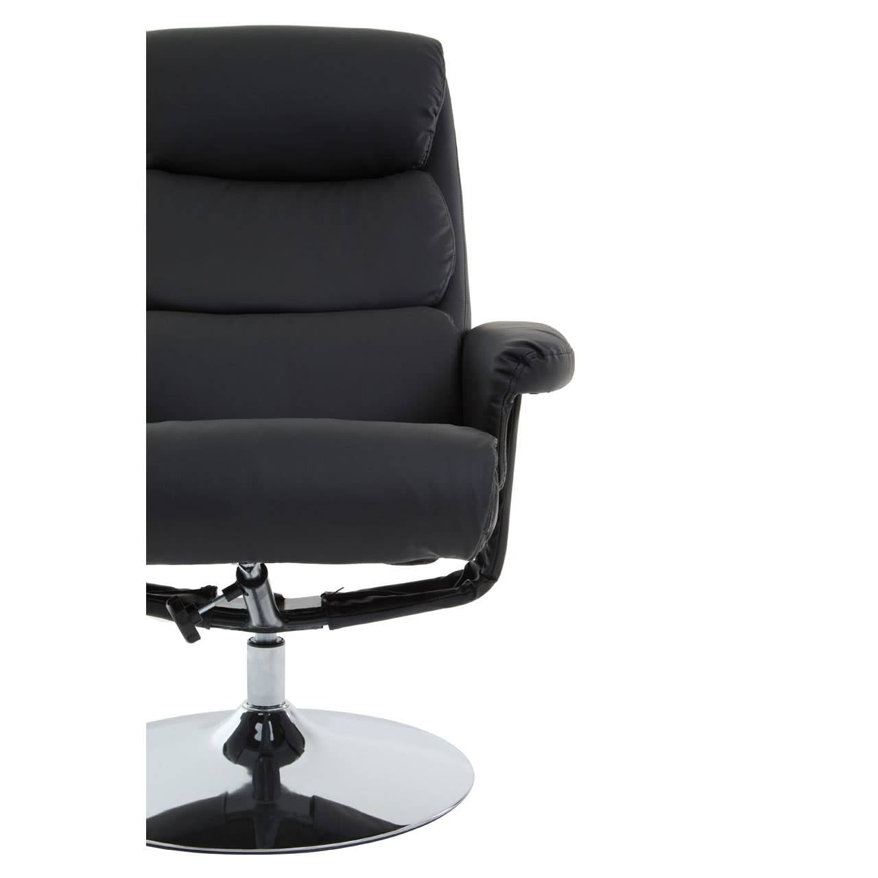 This recliner chair and footstool are upholstered in matching black PU leather with plush foam padding. To provide optimum relaxation, this ergonomic armchair has an adjustable backrest that is supported by a sturdy pedestal base in the chrome finish.