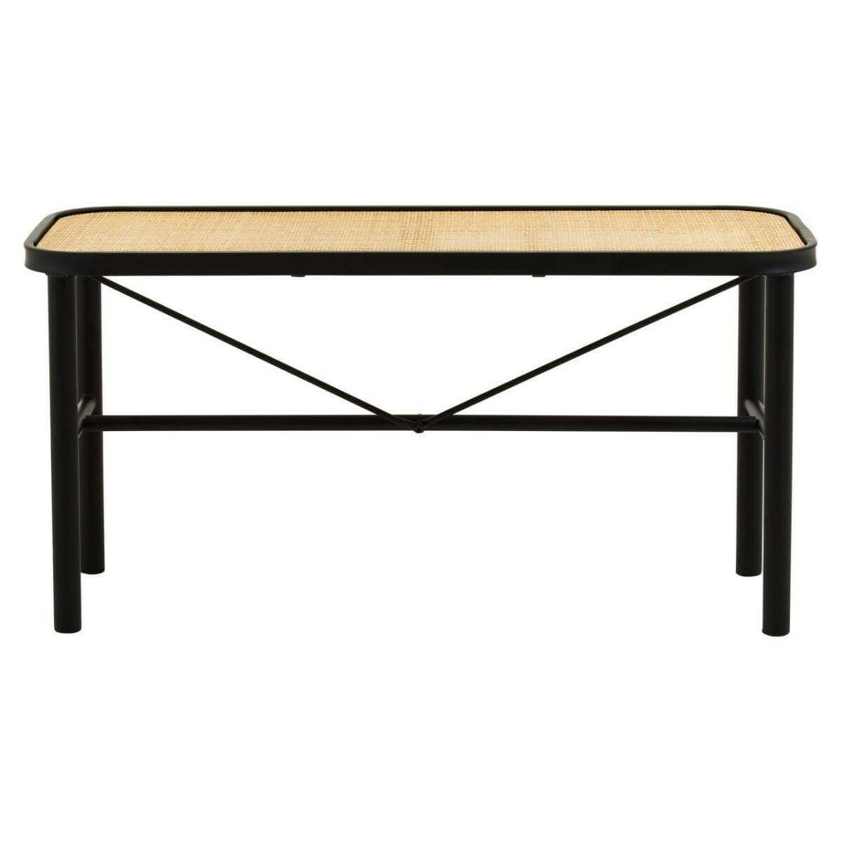 This bench has a rectangular seat that is intricately hand woven with natural rattan cane webbing. The seat in organic warmth and texture, is fixed inside a black metal frame with tubular legs creating a simple and minimalist look.
