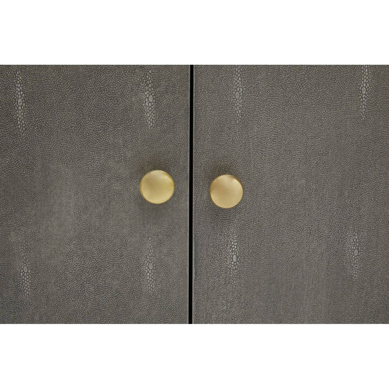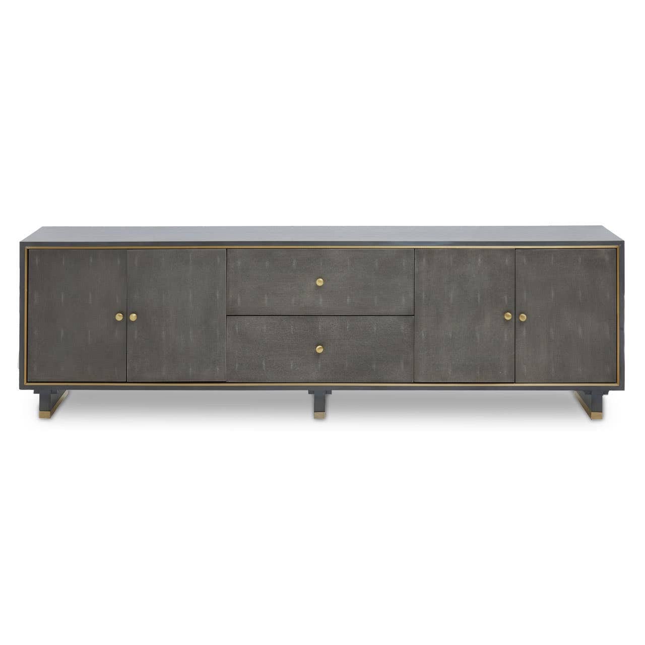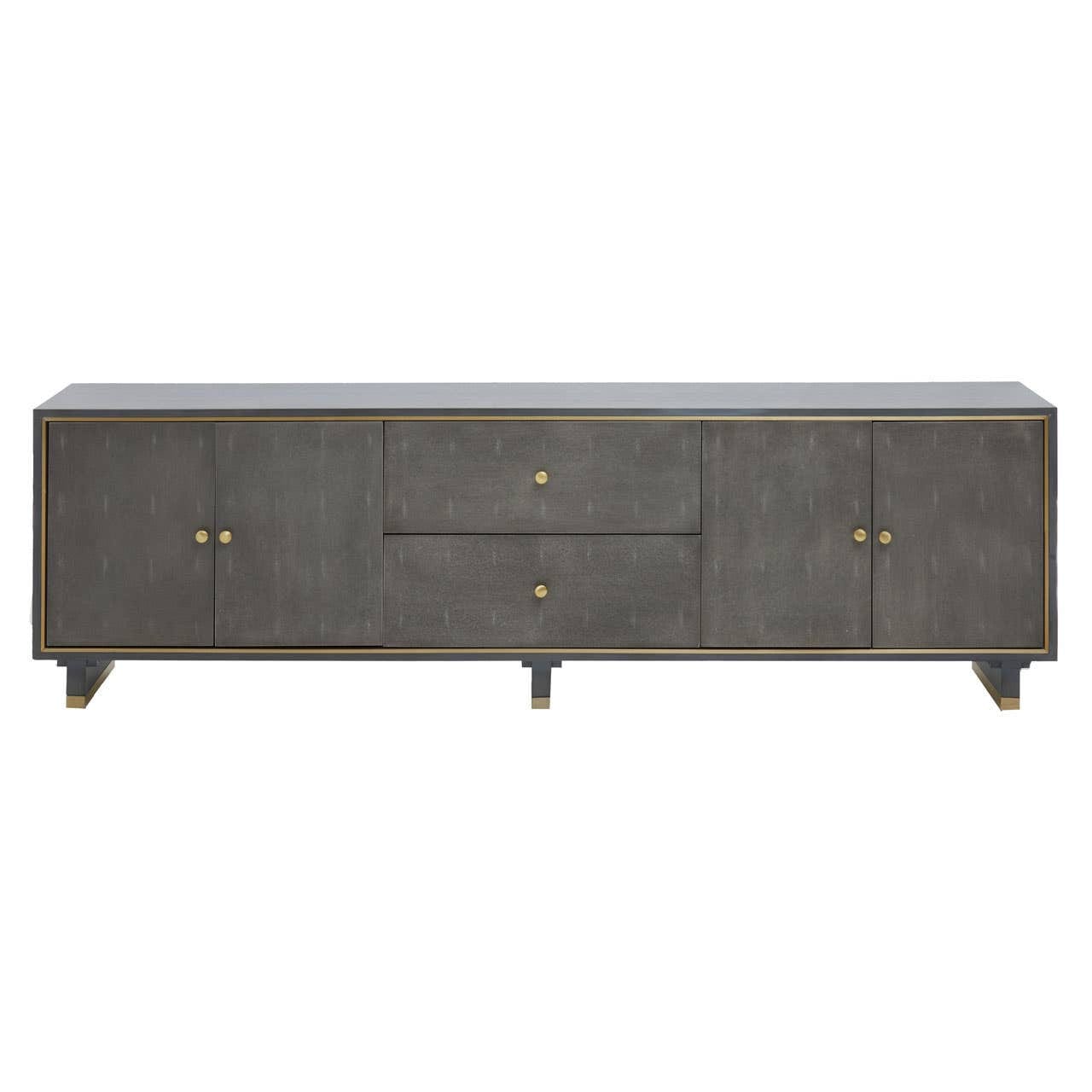Designed to combine style with functionality, the media unit has a grey shagreen effect that adds texture and visual interest, while the gold detailing along the edges elevates its luxurious look. It offers ample storage space with spacious shelves and two drawers, perfect for organising media and electronics.