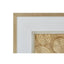 The slim rectangular frame has a textured gold finish that contrasts with the crisp white mount. The mount is stepped, adding depth to the piece and drawing eyes to the metallic gold focal point. The gold circles swirl against a molten backdrop, enhancing the textural appeal of this stylish accent piece.