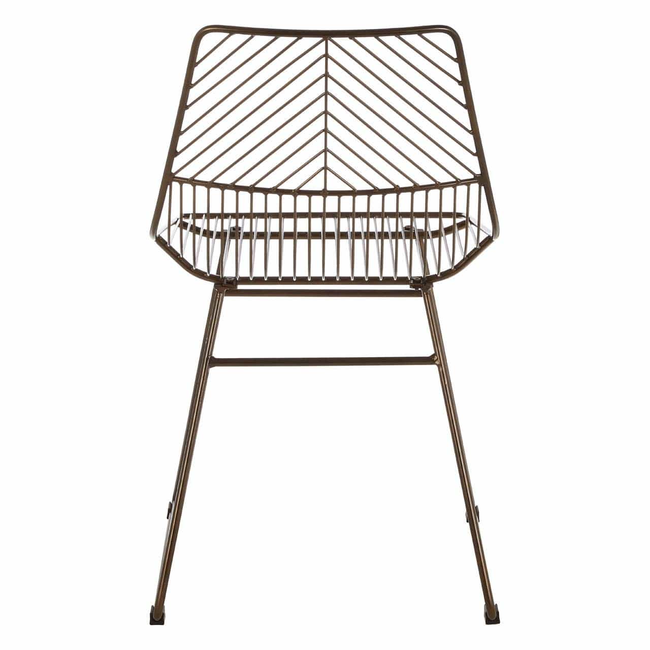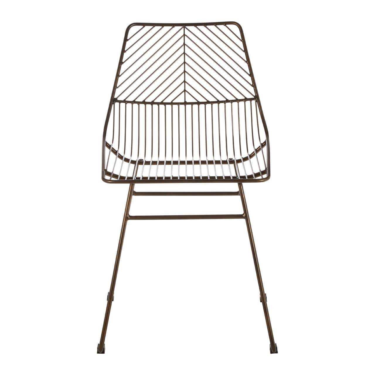The District chair is made from bronze metal and has an openwork design that complements geometric furniture and accessories. The chair's thicker outer frame helps to accentuate the multi-directional wires that form the seat and backrest. A pair of metal A-frame legs contribute to the chair's minimal look.