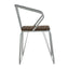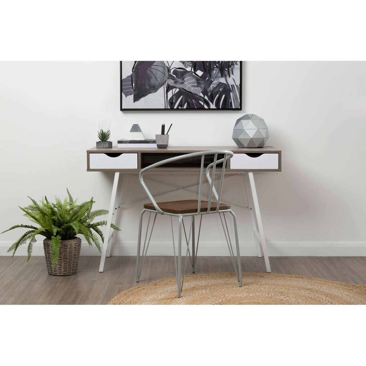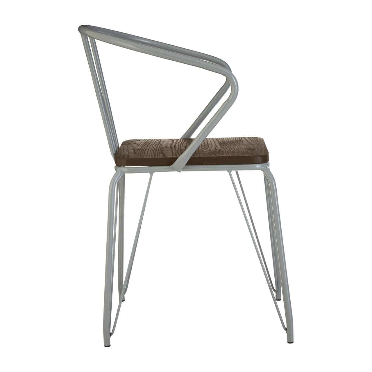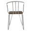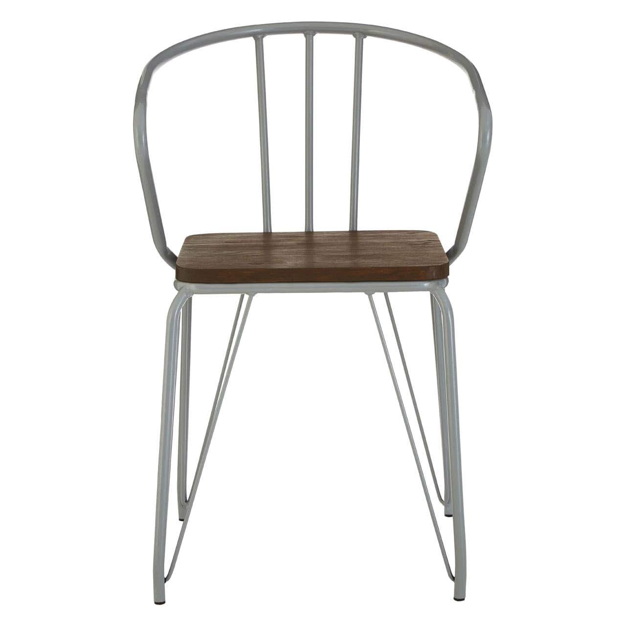 The district chair is formed around a frame made from grey metal. It features hairpin legs and a wide and rounded backrest with a trio of vertical tubes running down its central section. The natural elm wood seat boasts a rich grain and textured finish that distinguishes itself from the smooth metal.