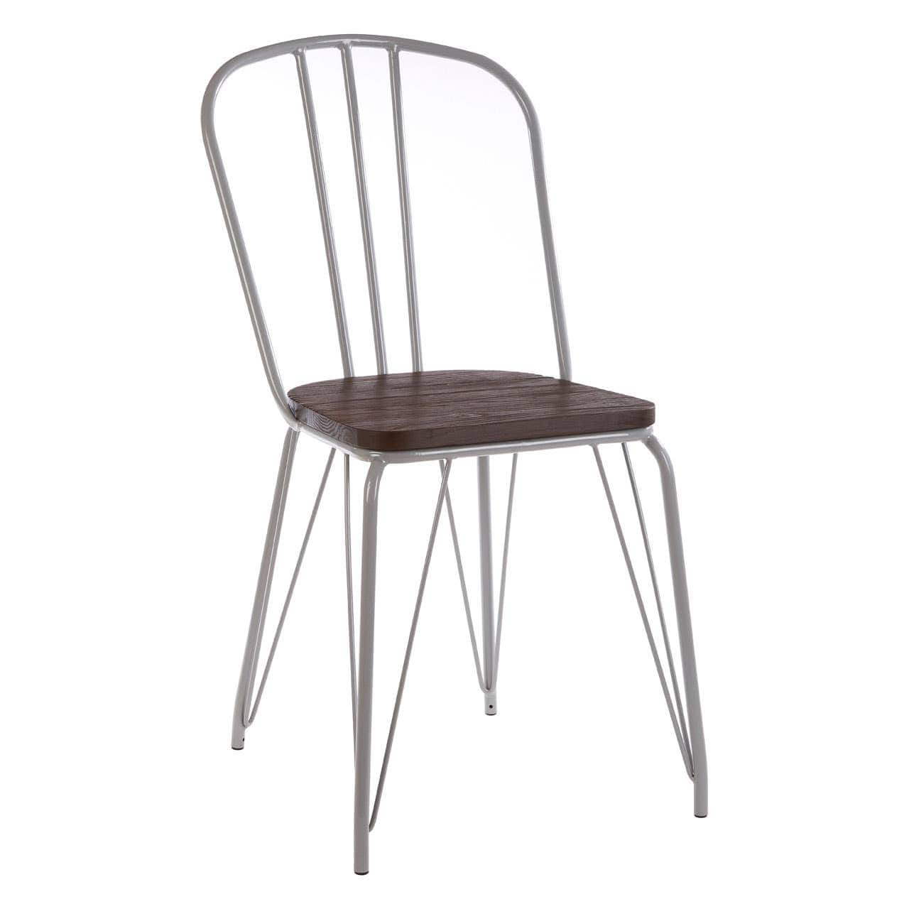 The piece of square wood that forms the chair's seat is made from natural elm. Its rich brown colour, interlocked grain and slightly coarse texture create an earthy juxtaposition to the grey metal frame. The chair's legs have a hairpin design and its high back is angled to provide a relaxed seating position.